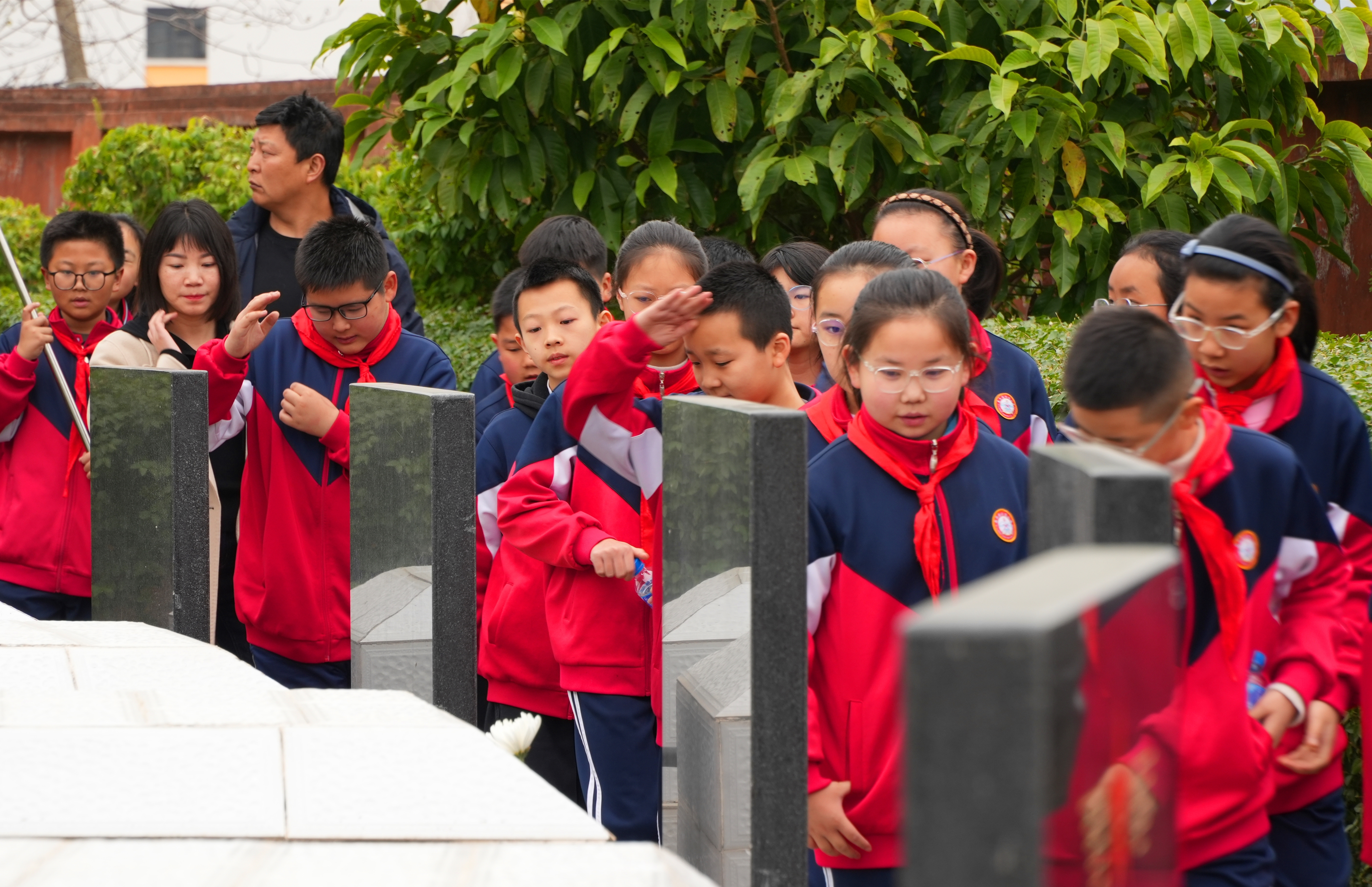 在庄严肃穆的氛围中,大家怀着无比崇敬的心情,肃立默哀、鞠躬致敬,聆听革命烈士的英勇事迹,向革命烈士敬献花篮鲜花,为革命先烈擦拭墓碑。少先队员用清澈而坚定的声音唱响《我们是共产主义接班人》,向先烈们宣告新时代少年将肩负起传承红色基因的重任。共产党员重温入党誓词,从追忆先烈的光辉足迹中汲取砥砺前行的智慧和力量。