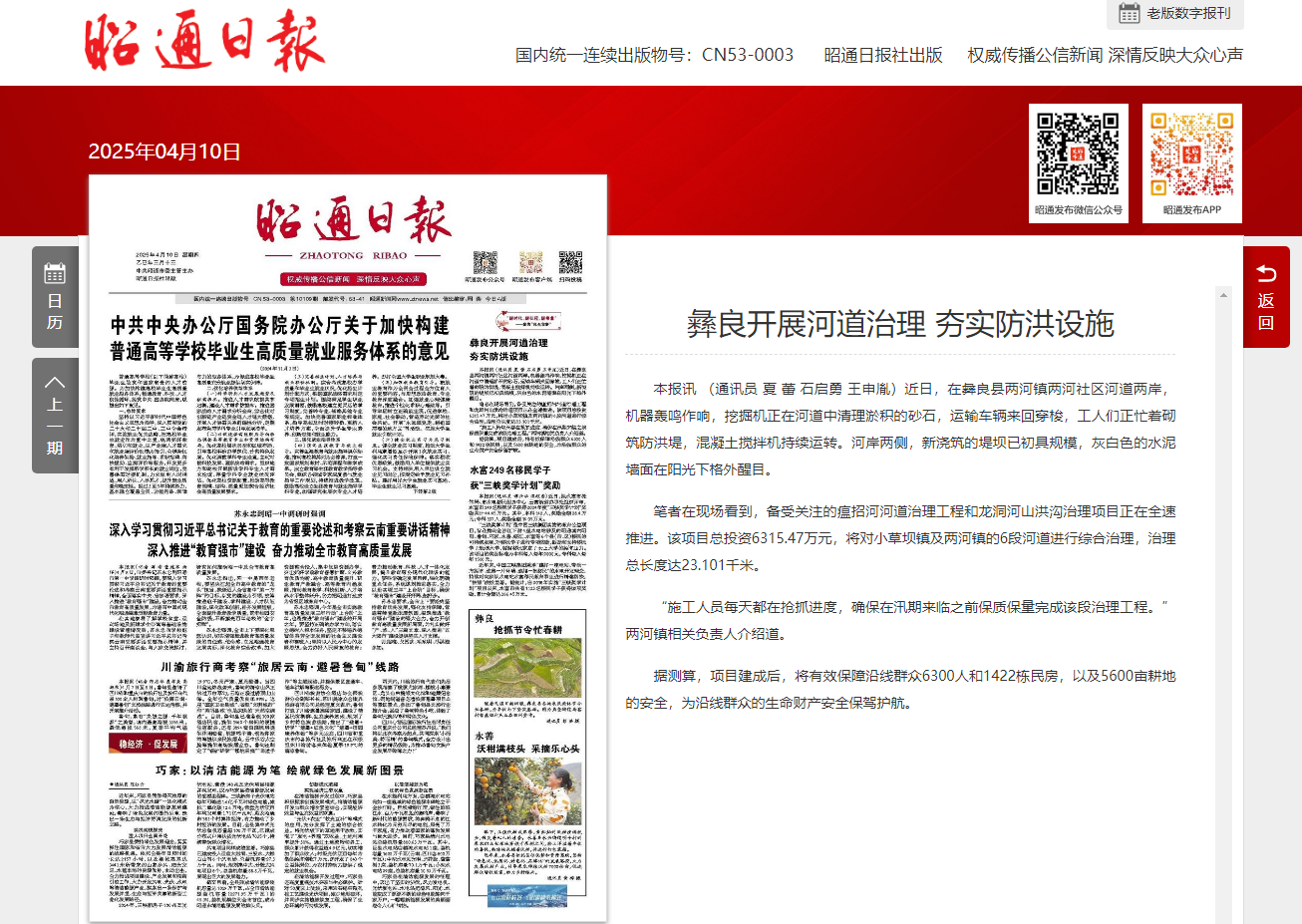 本报讯 (通讯员 夏 蕾 石启勇 王申胤)近日,在彝良县两河镇两河社区河道两岸,机器轰鸣作响,挖掘机正在河道中清理淤积的砂石,运输车辆来回穿梭,工人们正忙着砌筑防洪堤,混凝土搅拌机持续运转。河岸两侧,新浇筑的堤坝已初具规模,灰白色的水泥墙面在阳光下格外醒目。