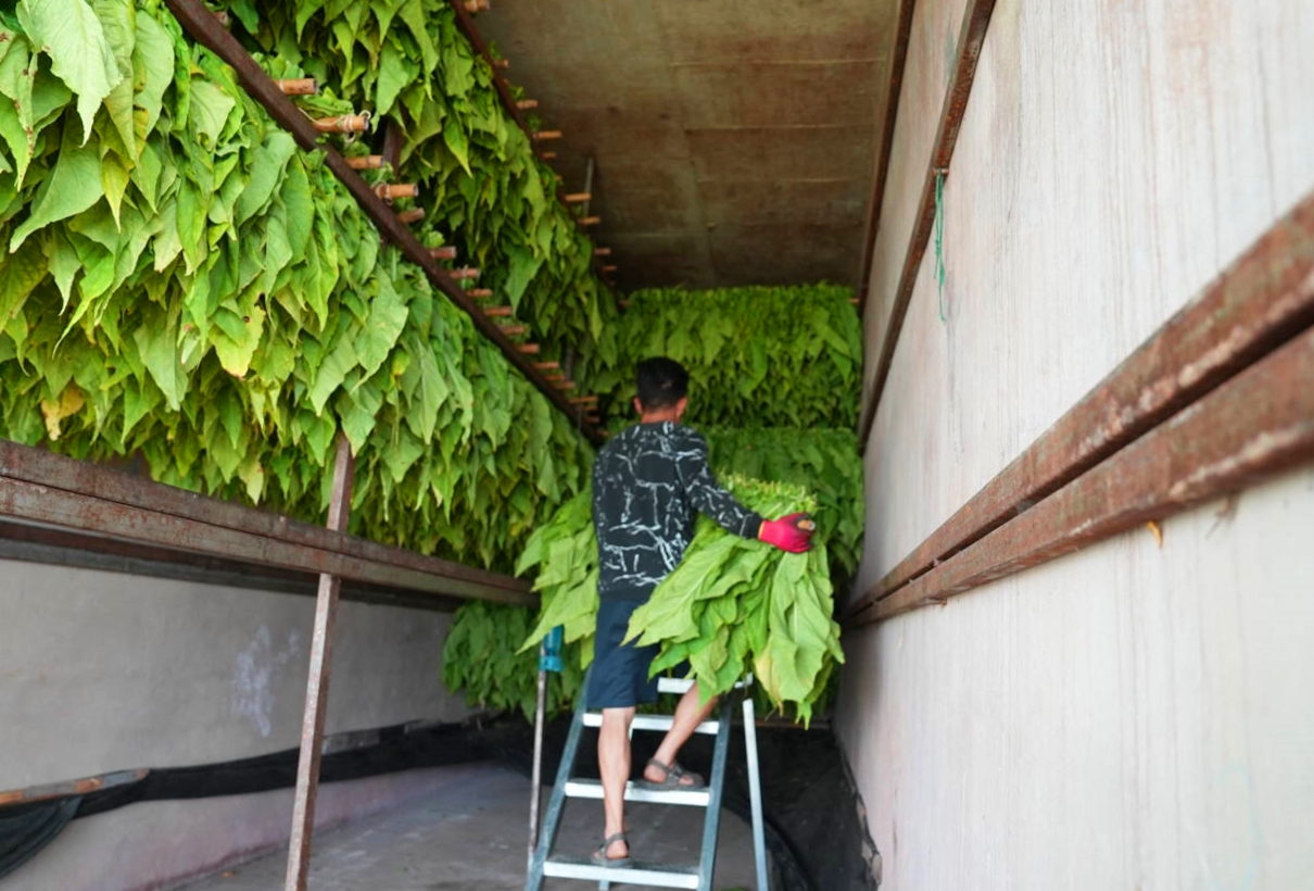 在尖山村烤烟种植大户梁昌银家的院坝里,十多位村民正在紧张忙碌着。他们分工协作、配合默契,整理烟叶、编杆上架、送入烤房,各环节有条不紊。烤房外的密集烤房控制器实时显示着烘烤的温度曲线。随着时间的延续、燃料的添加,炕房内的温度稳步上升,翠绿的烟叶在高温中悄然蜕变,逐渐转为金黄。