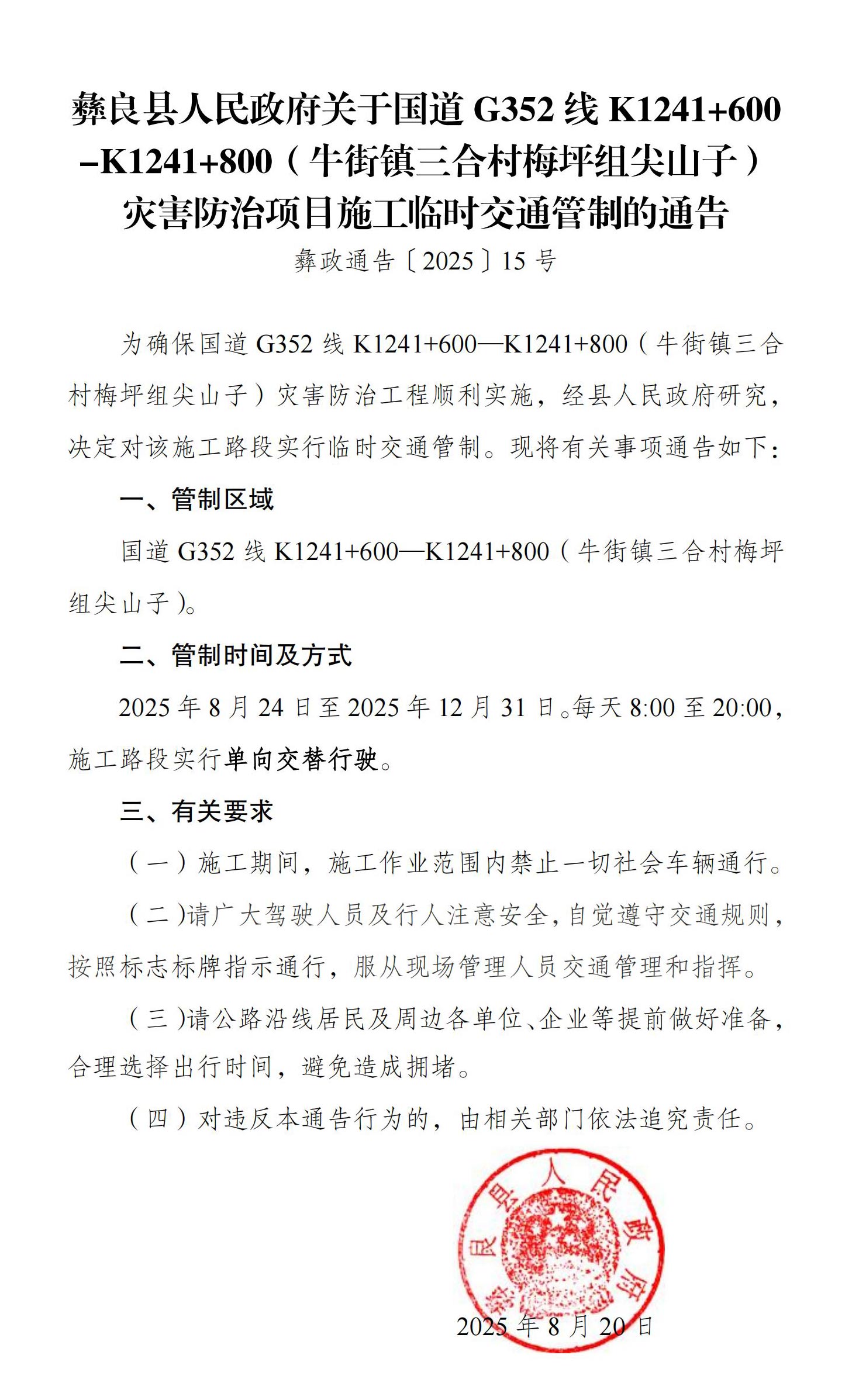 彝良牛街镇三合村梅坪组尖山子临时交通管制的通告
