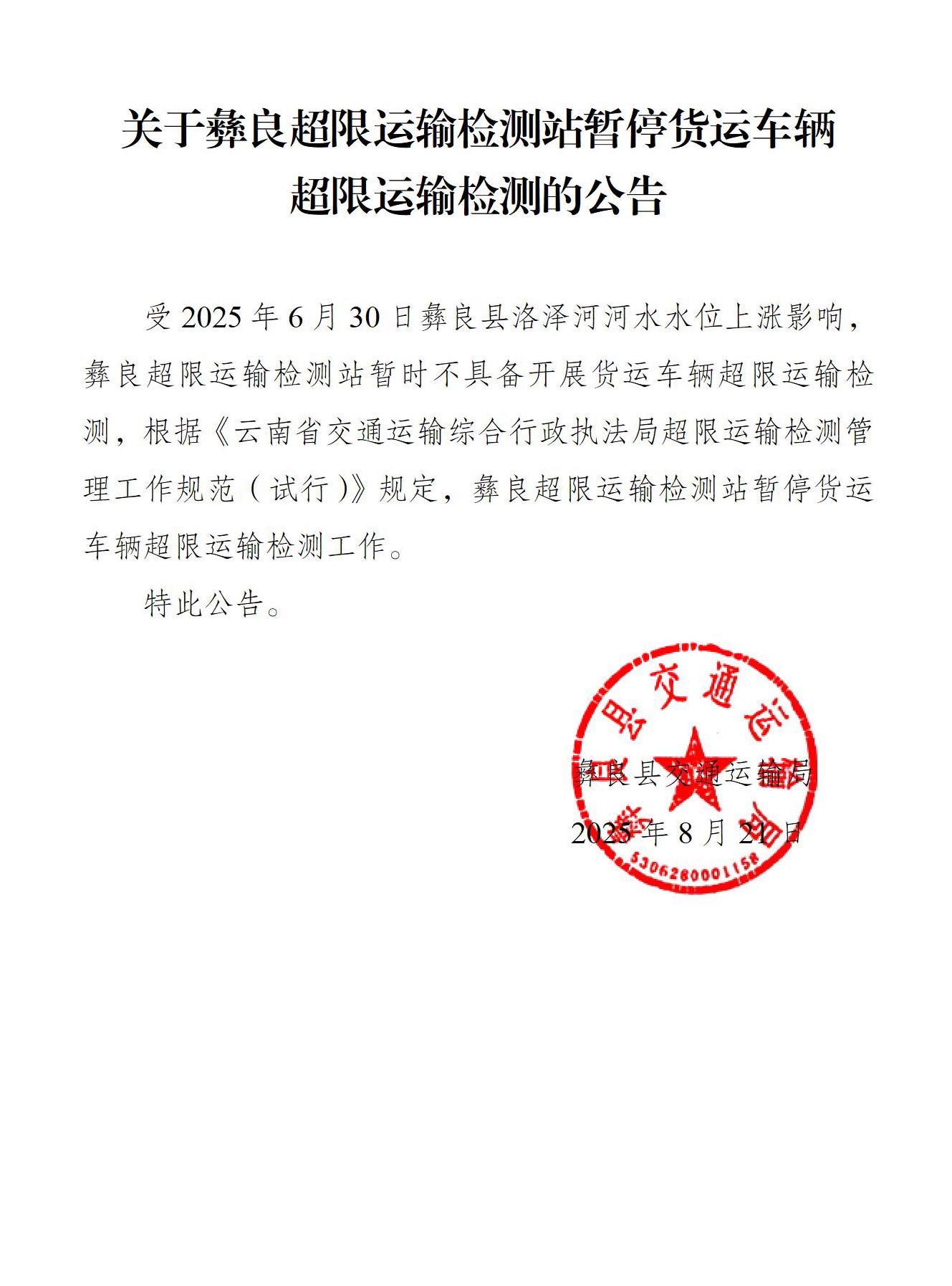 关于彝良超限运输检测站暂停货运车辆超限运输检测的公告