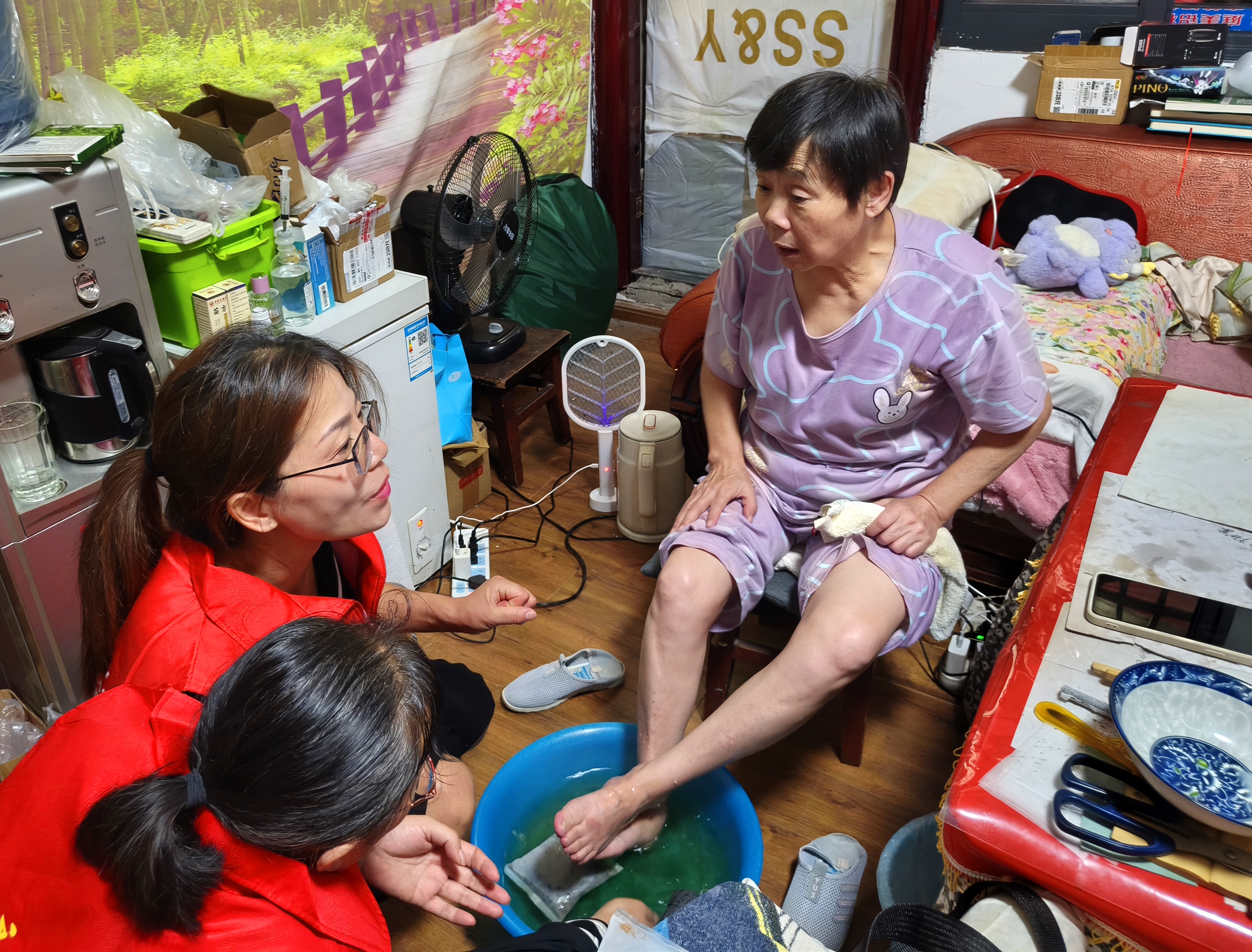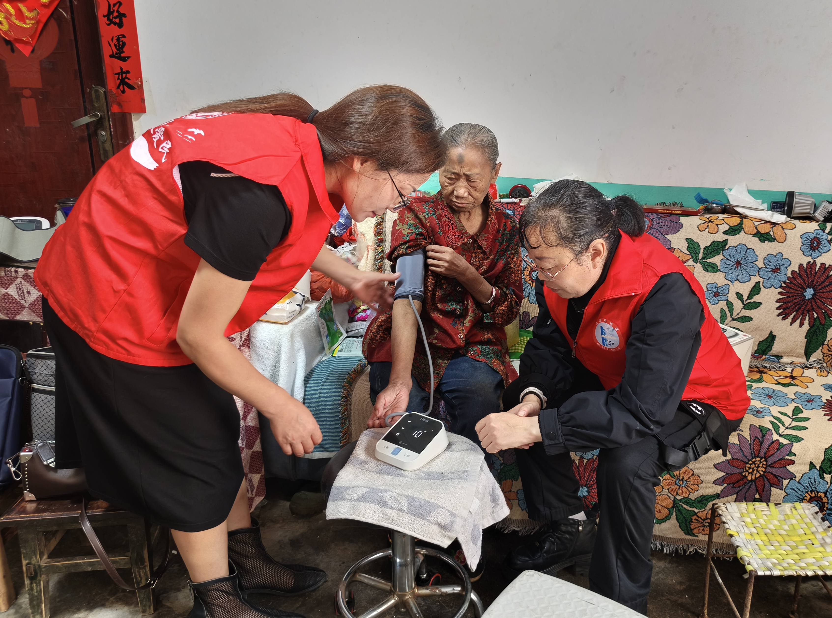 探访中,志愿者帮助老人整理床铺、打扫卫生,细致清理家中积尘。工作人员还为老人测量血压、血糖,针对健康状况提供个性化建议,并赠送泡脚包、讲解简易按摩方法,同时建立健康档案以便持续跟踪。