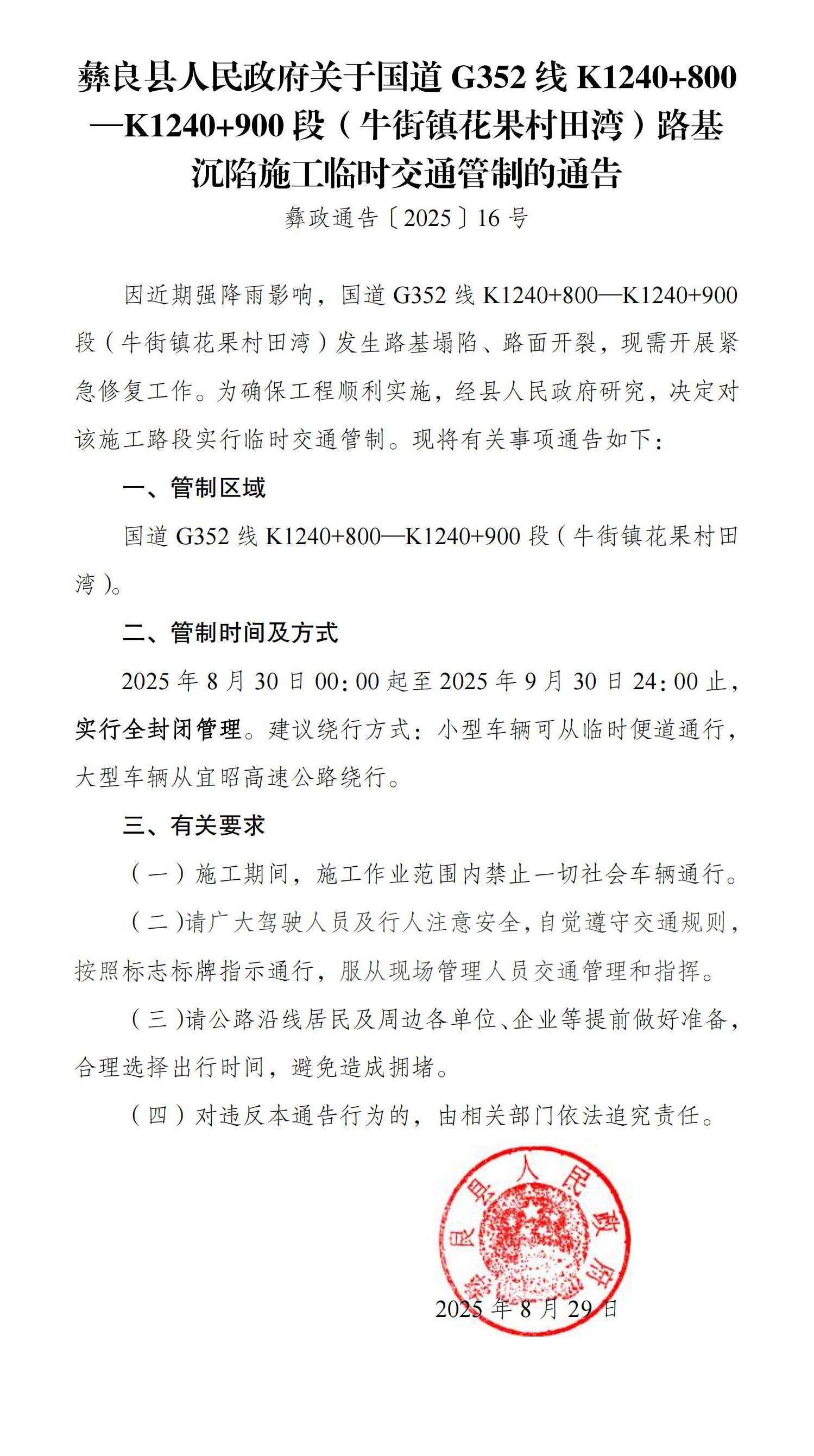 彝良县人民政府关于国道 G352 线 K1240+800 —K1240+900 段(牛街镇花果村田湾)路基沉陷施工临时交通管制的通告