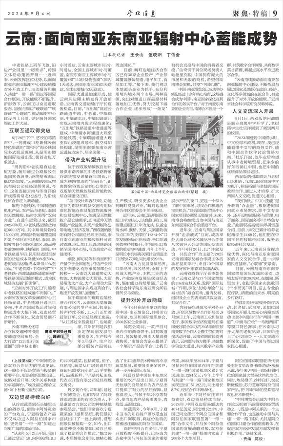 “云南持续推动面向南亚东南亚辐射中心建设,不断拓展与周边国家及地区在政治、经济、文化等多领域的交流合作,有效提升了对外开放的能级。”云南省社会科学院研究员韩博说。