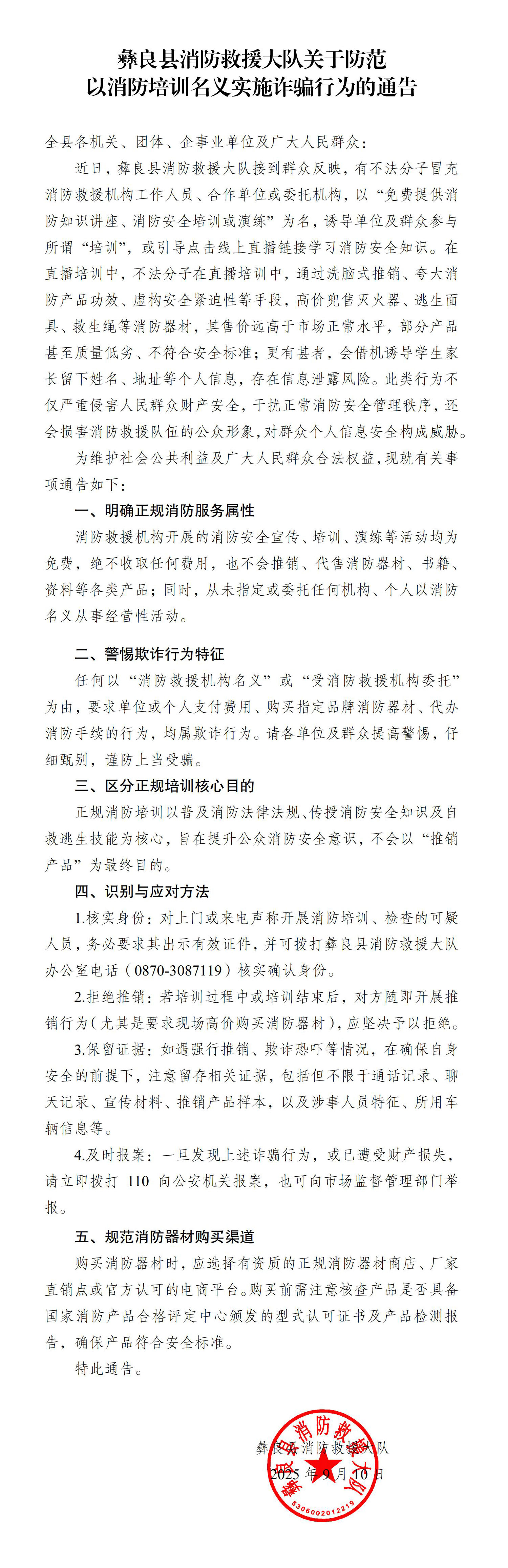 彝良县消防救援大队关于防范以消防培训名义实施诈骗行为的通告