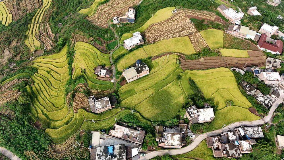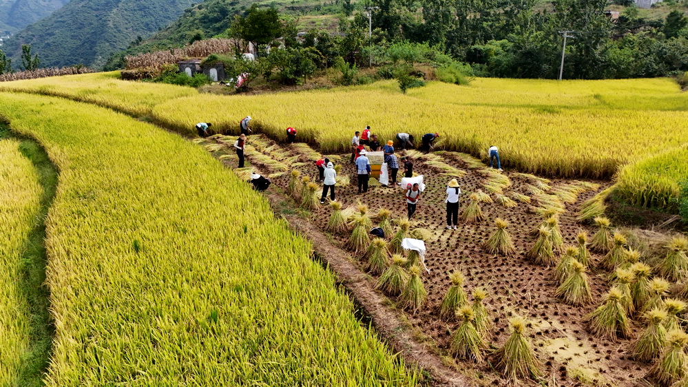 在彝良县角奎街道马窑村,水稻陆续进入成熟期,村民们正抢抓晴好天气开镰收割。田间地头,割稻、脱粒、装袋、运输……忙碌的身影与金黄的稻浪共同奏响秋收交响曲。一大早,水稻种植户刘明兵一家就开始了收割工作,村“两委”干部和驻村工作队员也加入其中,大家分工协作,干劲十足。尽管汗水浸湿衣背,每个人的脸上却都洋溢着丰收的喜悦。