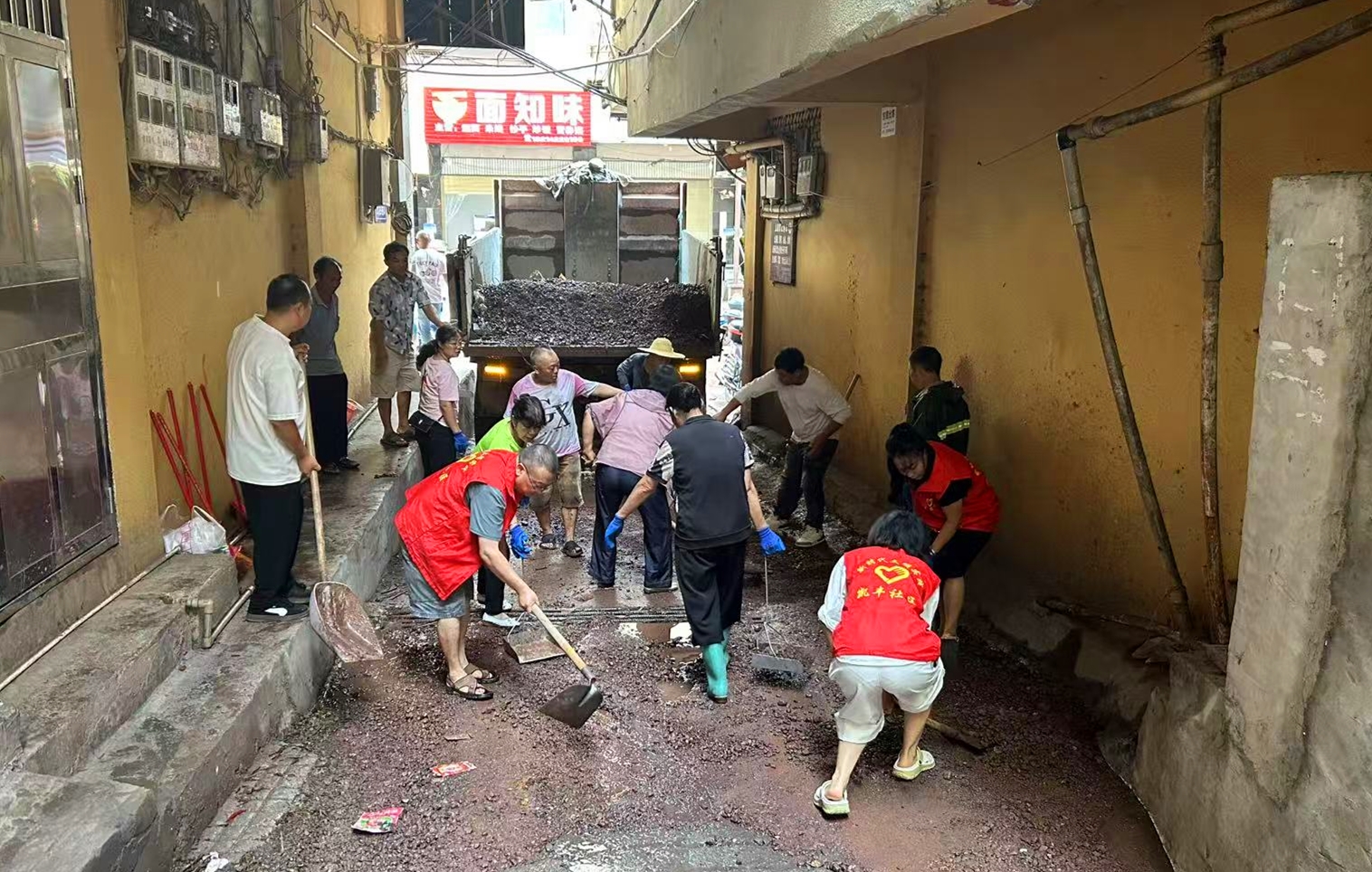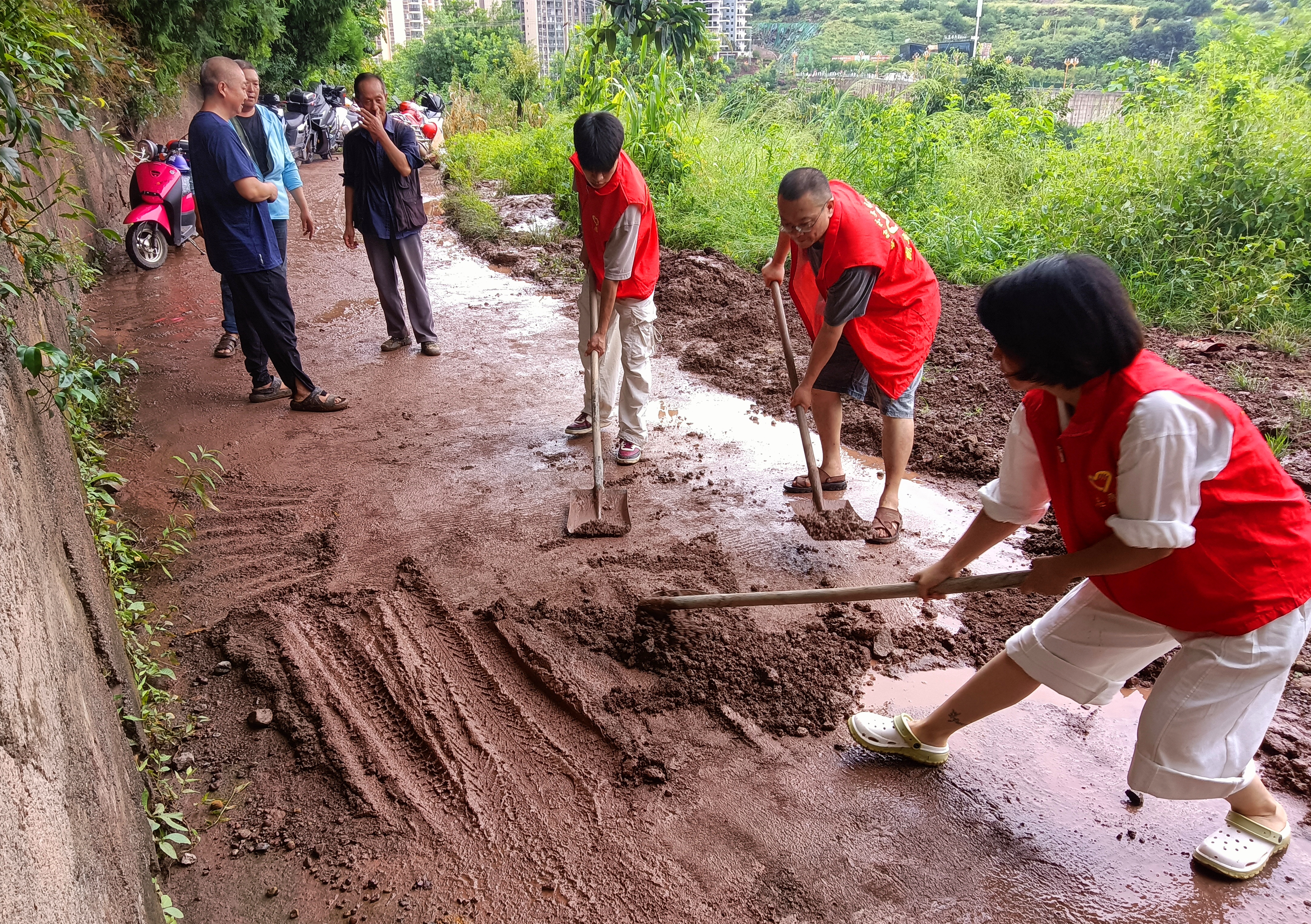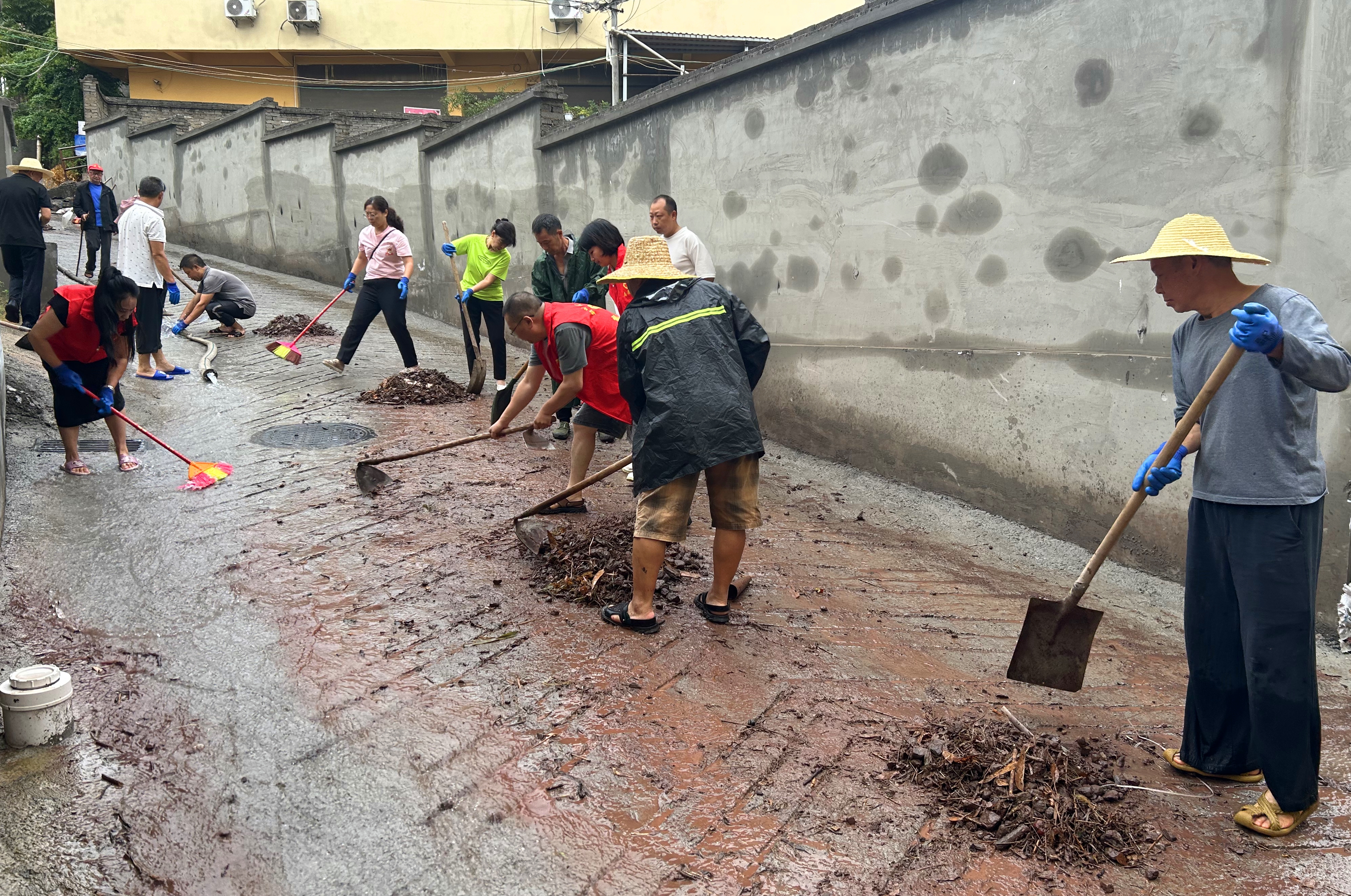 大雨过后,社区多处路面淤泥板结、石块掺杂,通行极为不便。清晨,社区干部和党员代表自发携带铁锹、扫帚和推车等工具奔赴现场,投入清理工作。党员冲在前方,奋力铲除厚重淤泥;社区干部细致清扫碎石缝隙;有人直接徒手搬移拦路石块。汗水与泥水交织,大家始终毫无怨言,全力恢复道路通畅。