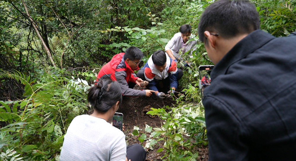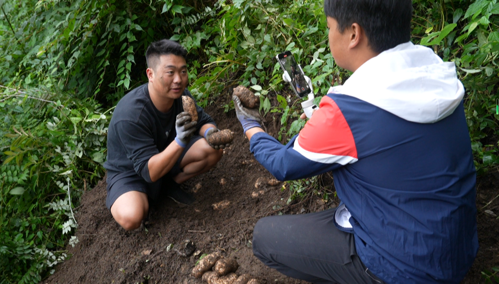 9月19日,一支来自昭通市的网红带货主播团队走进彝良县角奎街道云乐村,在天麻产地开展一场别开生面的助农直播活动。在海拔1900多米的云乐村密林深处,主播们亲自体验天麻采挖过程,一边小心翼翼地刨土采收,一边通过直播镜头向观众实时展示彝良天麻的原生生长环境、采挖过程和品质特点,让观众直观感受“从泥土到云端”的全过程。
