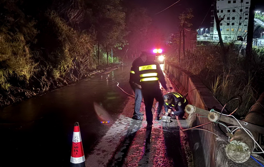 9月30日凌晨,执法人员在巡查返程中发现S304线k183+200米处有电杆倒塌、线缆坠路,存在安全隐患。他们立即设置警示标志,在确认安全后冒雨清理障碍,半小时内恢复道路畅通。