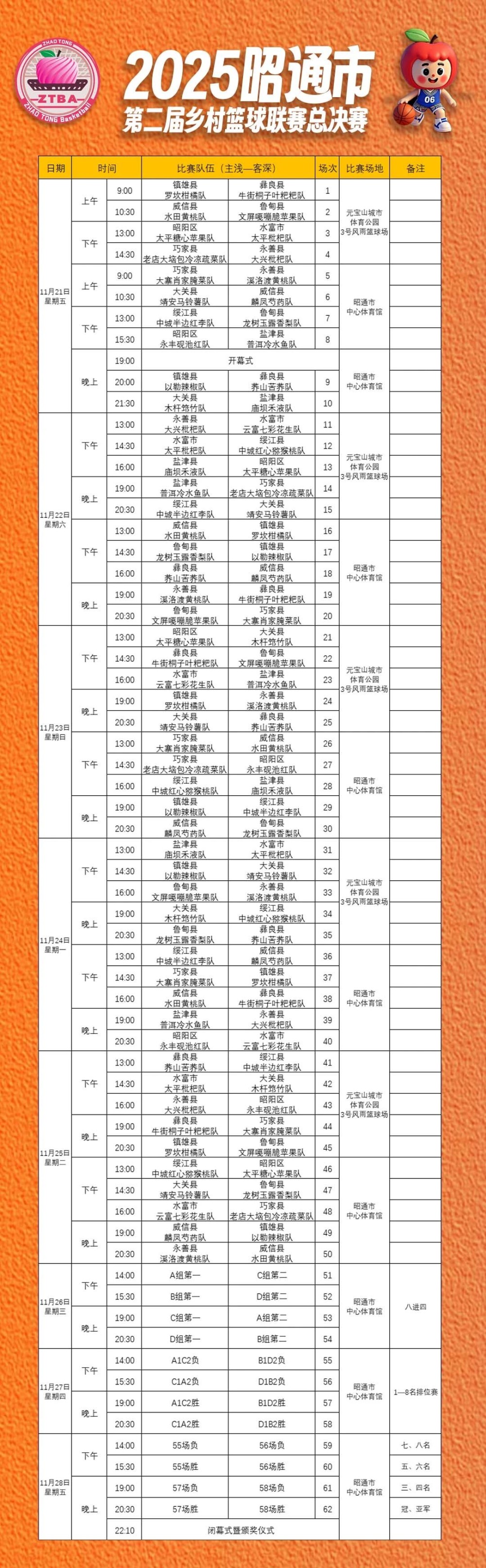 活动信息活动时间【活动时间】2025年11月21日-28日【开幕式时间】2025年11月21日晚19:00-19:40活动地点【昭通市中心体育馆】(开幕式/闭幕式/比赛)昭通中心体育馆【元宝山城市体育公园3号风雨篮球场】(比赛)元宝山城市体育公园3号风雨篮球场赛程安排