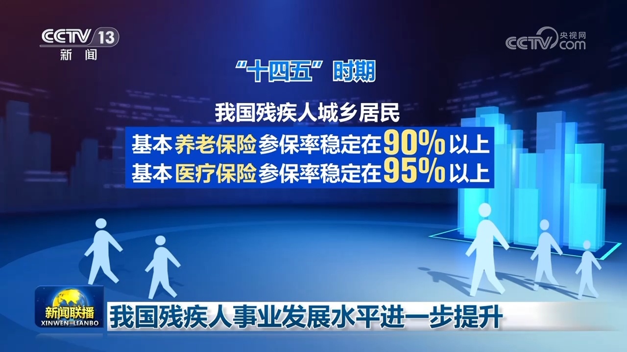 “十四五”时期,我国残疾人城乡居民基本养老保险、基本医疗保险参保率稳定在90%和95%以上,困难残疾人生活补贴和重度残疾人护理补贴平均标准分别提高了31.9%和22.5%。残疾儿童少年义务教育入学率达到97%。