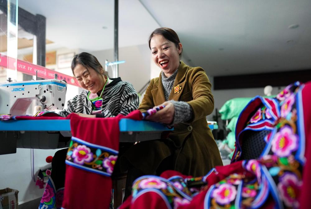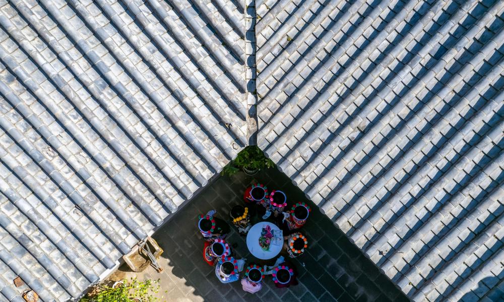 2月9日,金瑞瑞召集绣娘在自己的工作室内了解她们对彝绣产业发展的建议(无人机照片)。