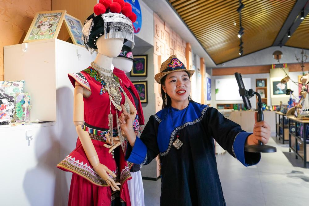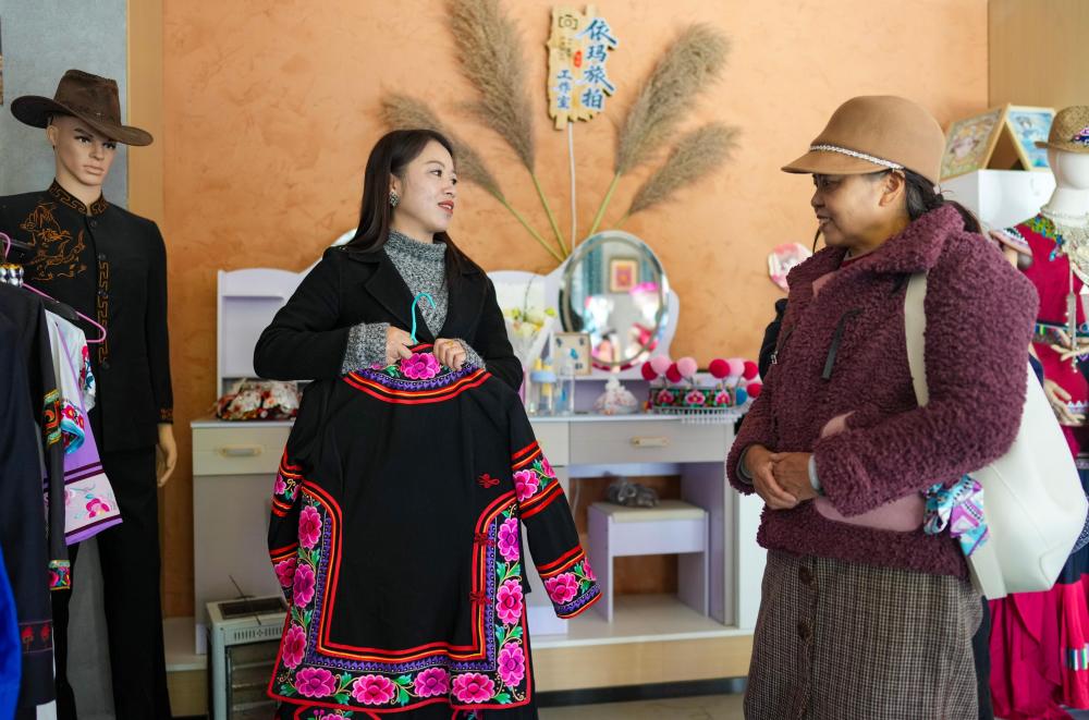 2月10日,金瑞瑞在自己的工作室内向顾客介绍彝绣服饰。