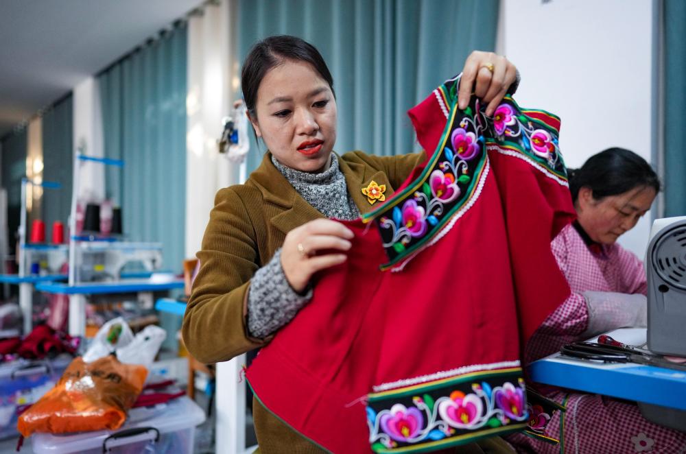 2月9日,金瑞瑞在自己的工作室内查看彝绣服饰。