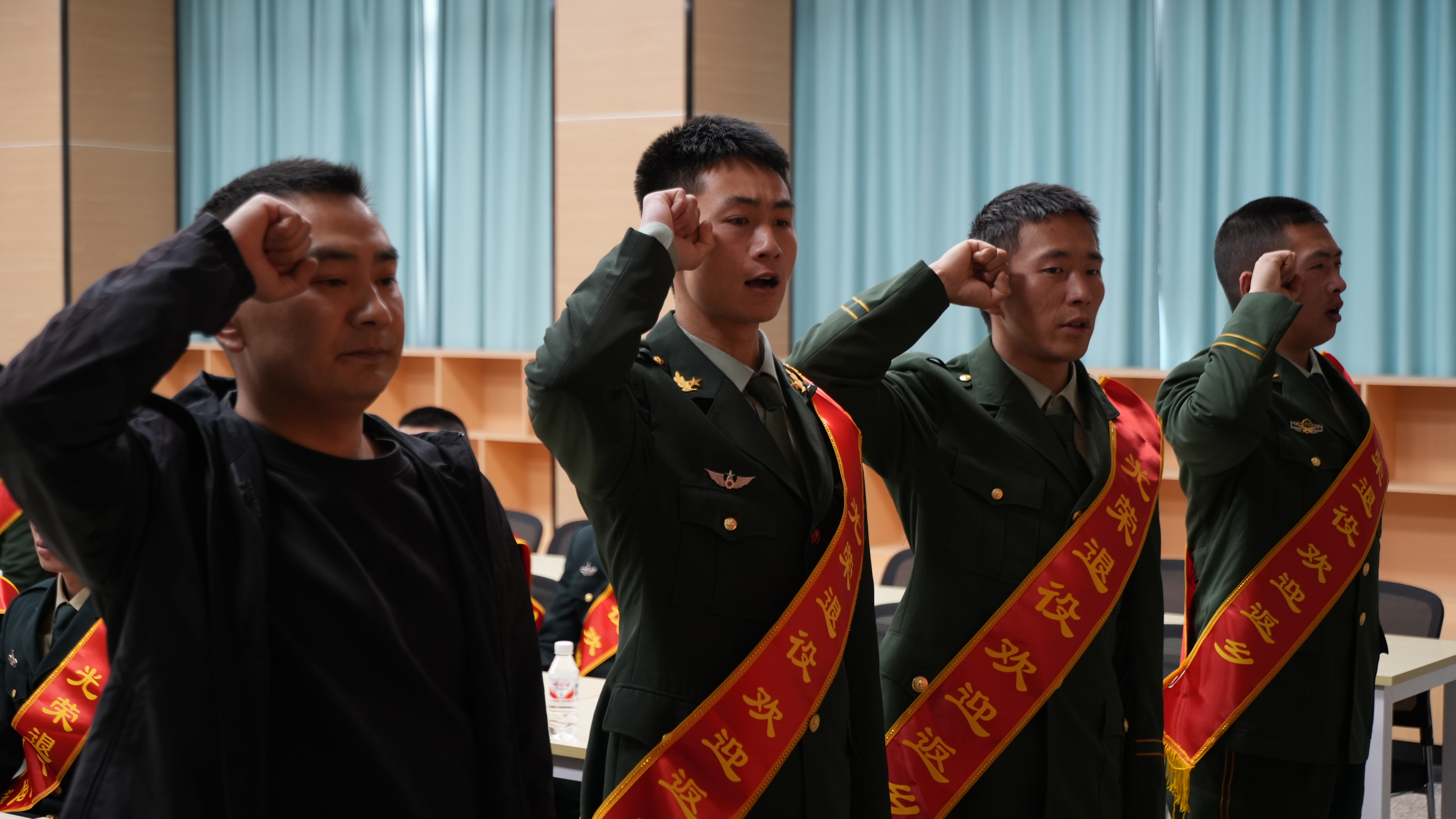 在热烈的氛围中,退役军人佩戴“光荣退役 欢迎返乡”绶带,重温退役誓词。