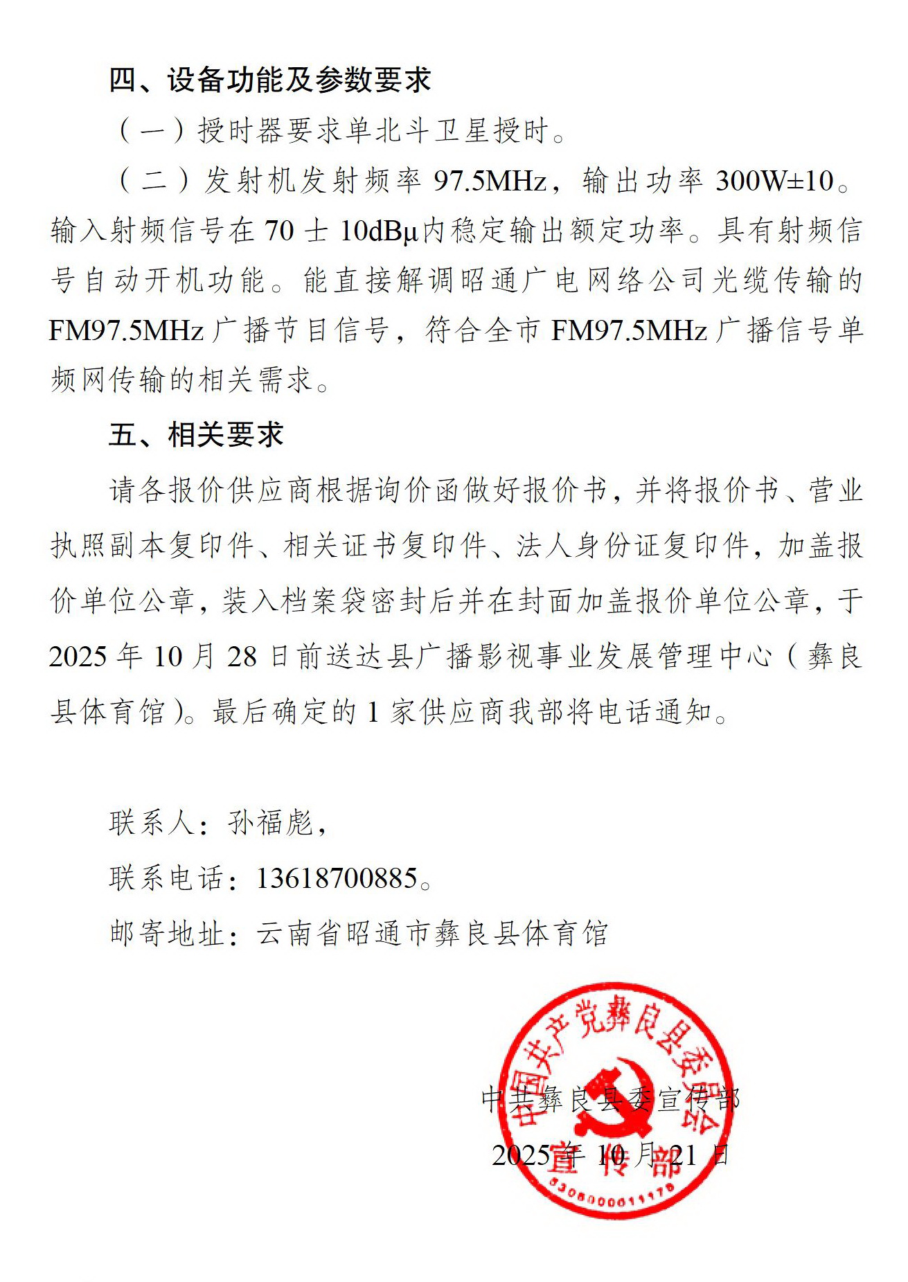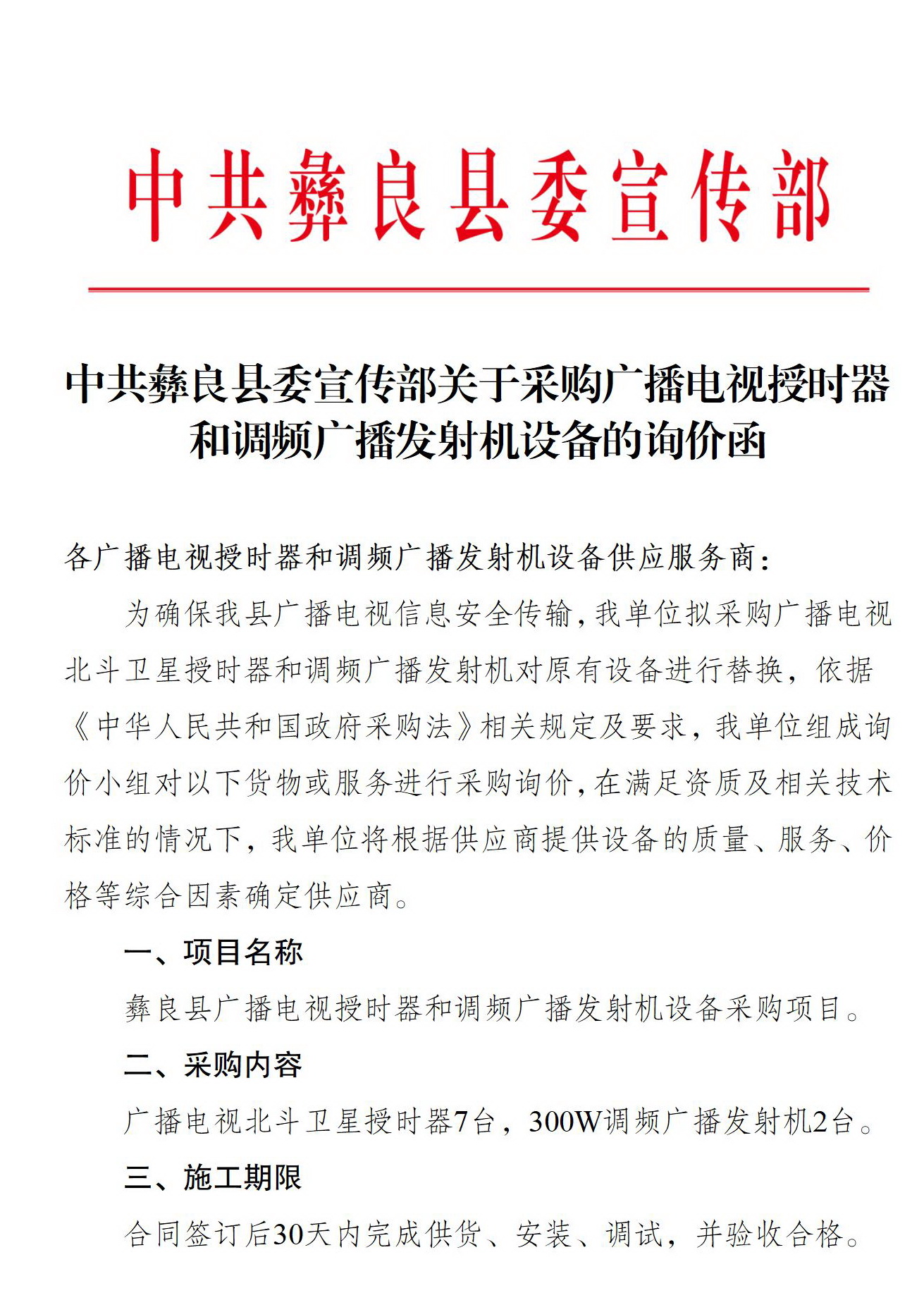 中共彝良县委宣传部关于采购广播电视授时器和调频广播发射机设备的询价函