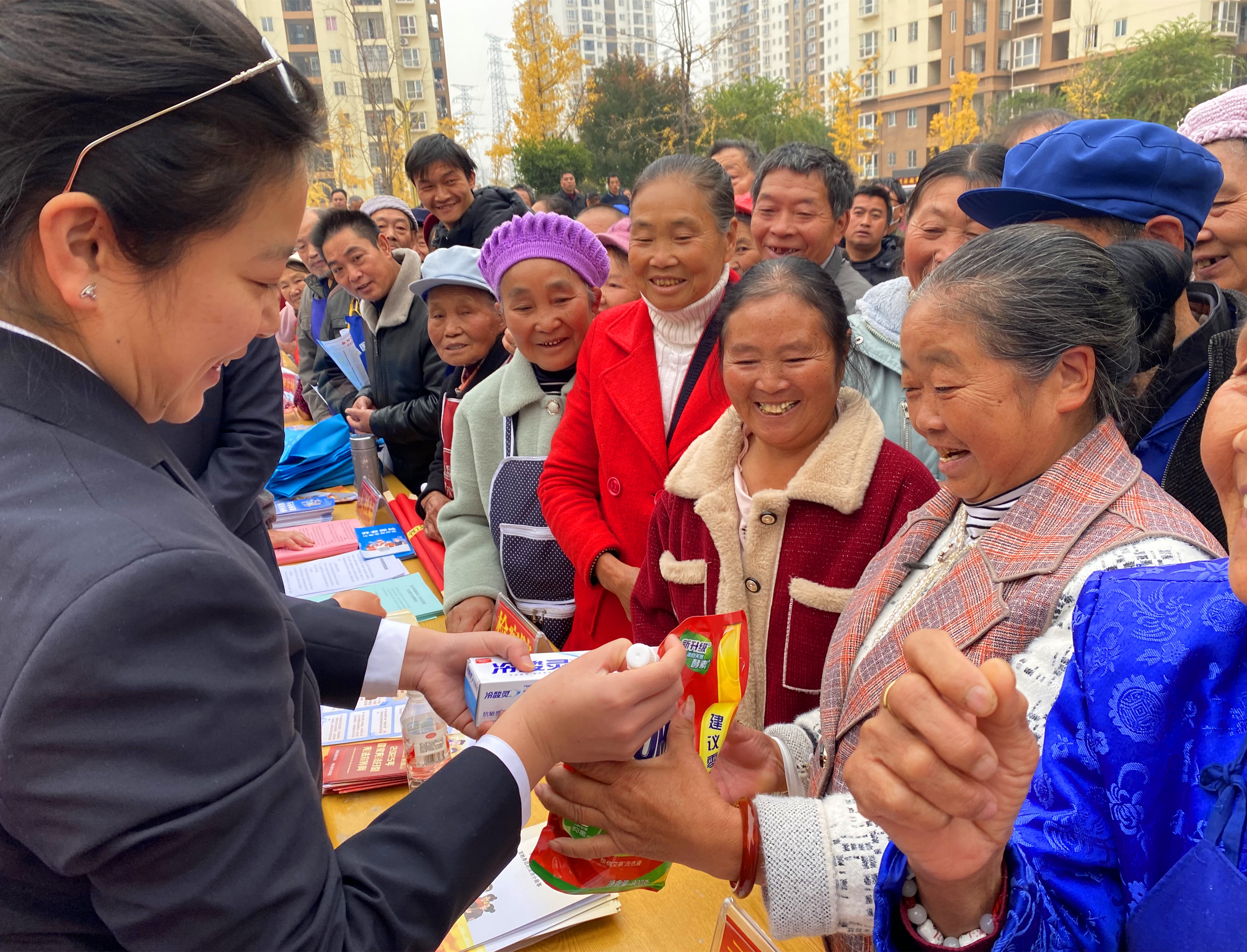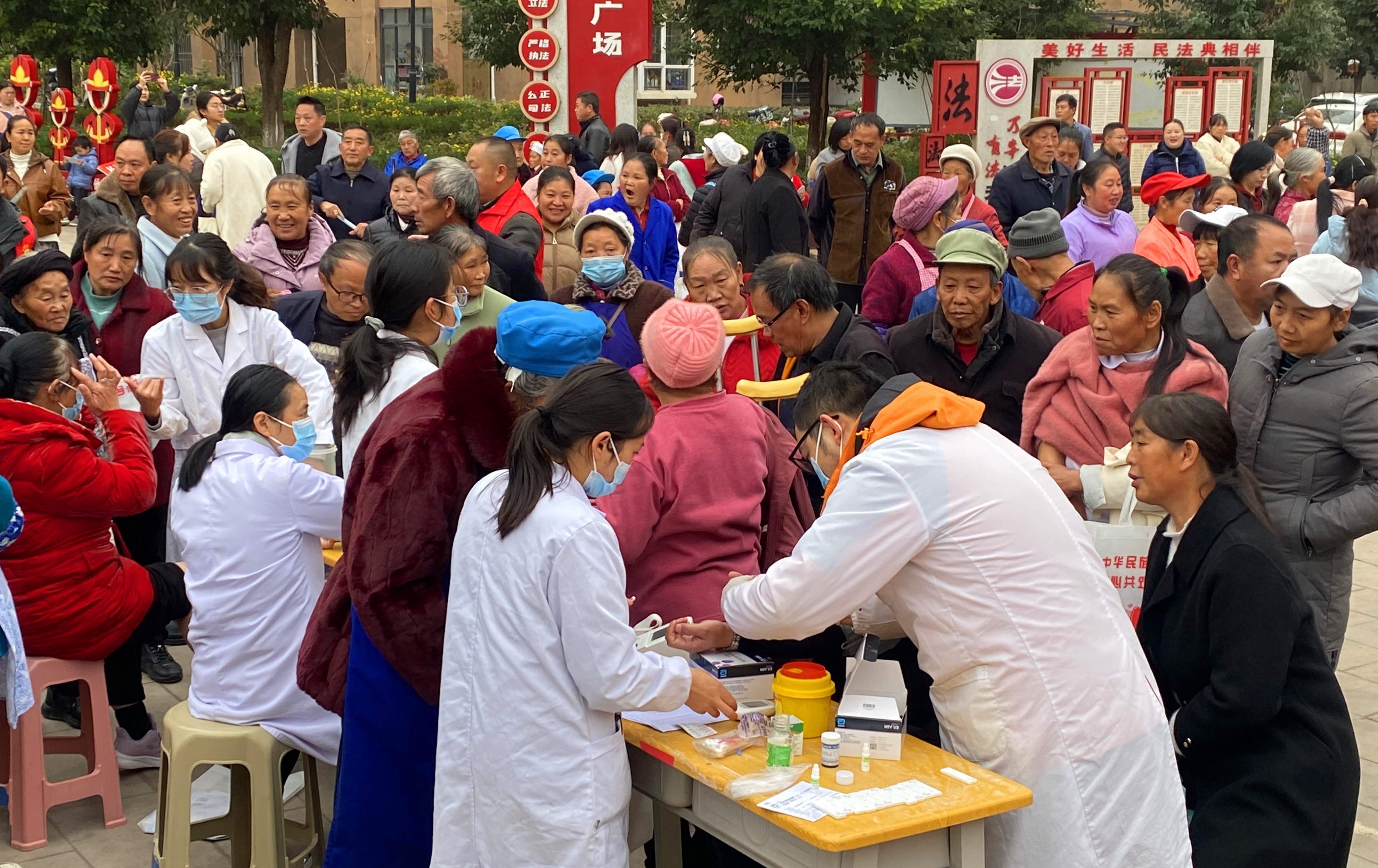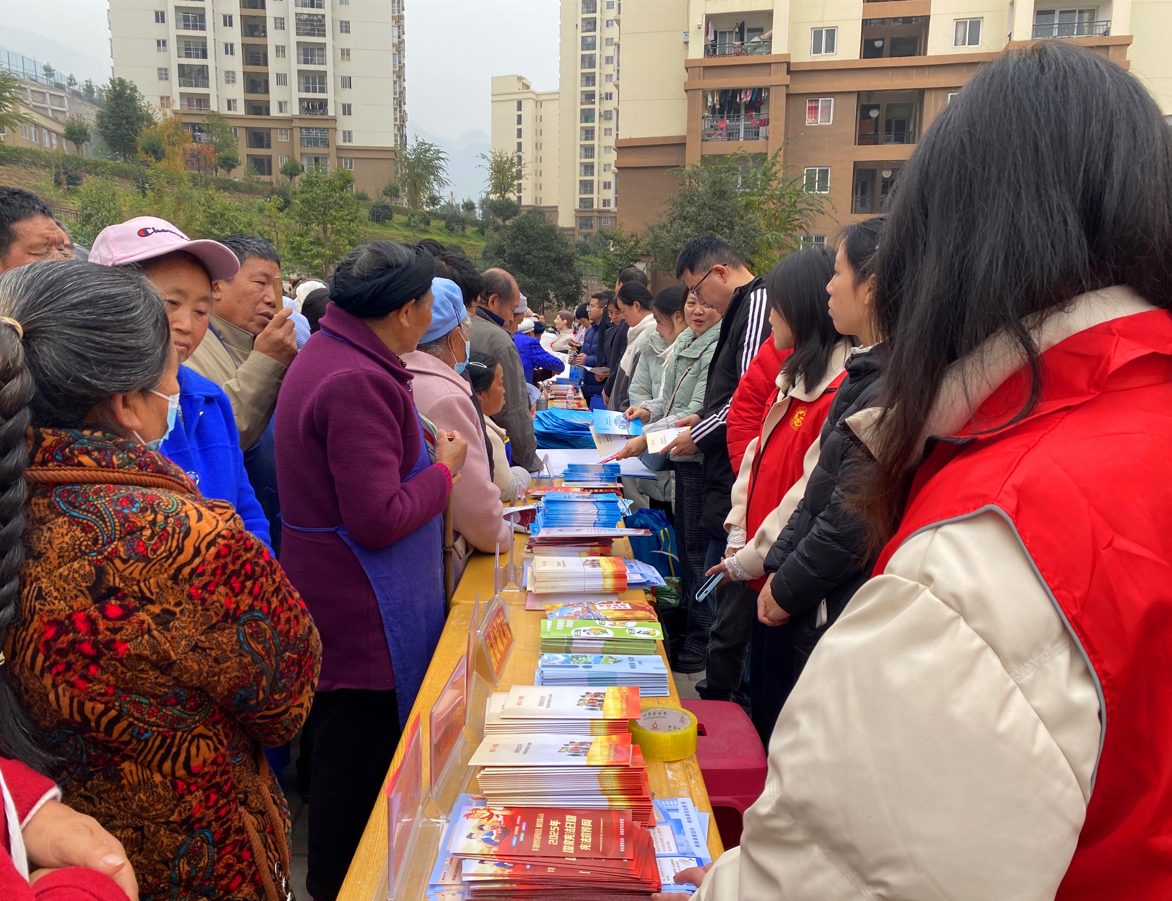 活动现场热闹有序,各类服务专区一字排开,50余名志愿者身着统一服装,各司其职、热情服务,让群众在家门口就能享受到多元便利服务。医护志愿者耐心为群众量血压、测血糖,提供健康问诊和用药指导,用专业守护群众健康;普法办志愿者结合案例开展宪法宣讲,为群众解答劳务纠纷、权益保障等法律问题,将法治温暖送到身边;社保、医保领域的志愿者则面对面解读参保缴费、报销流程等民生政策,确保群众读懂政策、享受红利;县交管大队志愿者发放交通安全手册,普及出行安全知识;红十字会志愿者现场开展应急救护培训,演示心肺复苏等急救技能,并提供献血咨询和救助指导,全方位筑牢生命安全防线。