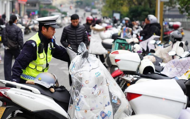 彝良交警在幼儿园门前执勤,将接送学生家长的电瓶车整齐摆放。
