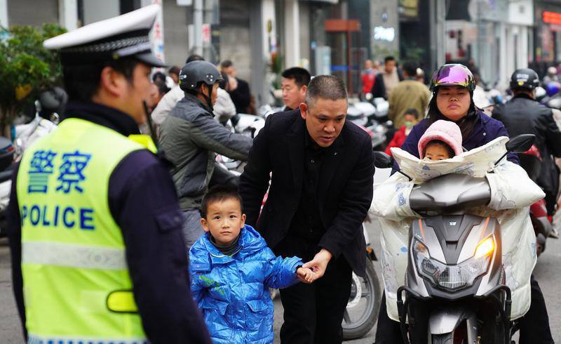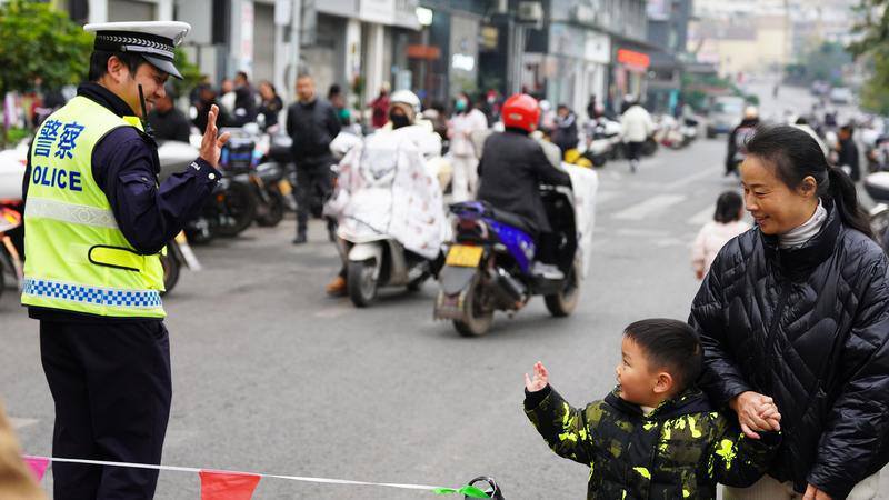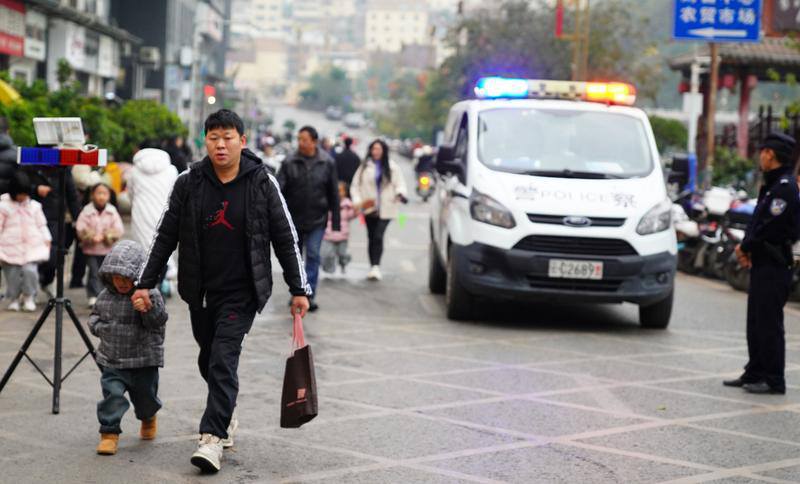 12月12日清晨,彝良交警在幼儿园门前执勤,为孩子们护航上学路。12月2日是全国交通安全日,昭通市彝良县多部门例行联合护学,在学校门口及周边重要路口路段指挥交通,引导车辆有序通行,守护学生平安上下学路。