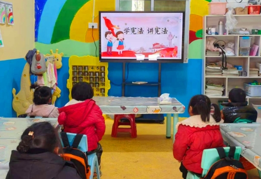 法治进校园,护航成长路。宣传周期间,荞山镇实现全镇中小学、幼儿园宪法学习宣传教育全覆盖,让法治精神浸润童心。各学校充分利用国旗下讲话、主题班(队)会、法治副校长专题讲座等形式,开展丰富多彩的宪法专题教育活动。中小学生通过观看2025年新版宪法宣传动画、参与宪法知识竞赛、开展模拟宪法宣誓等互动形式,深刻领会宪法作为国家根本法的地位与作用,进一步增强尊法学法守法用法的意识。幼儿园则结合幼儿年龄特点,推出趣味普法活动:大班幼儿表演《宪法伴我成长拍手歌》,在欢快的节奏中开启法治启蒙;教师通过普法动画展示、趣味问答等方式,生动讲解国旗、国徽、国歌的含义,并结合日常行为规范,巧妙链接宪法原则与儿童生活场景,让法治种子在孩子们的幼小心灵中生根发芽。