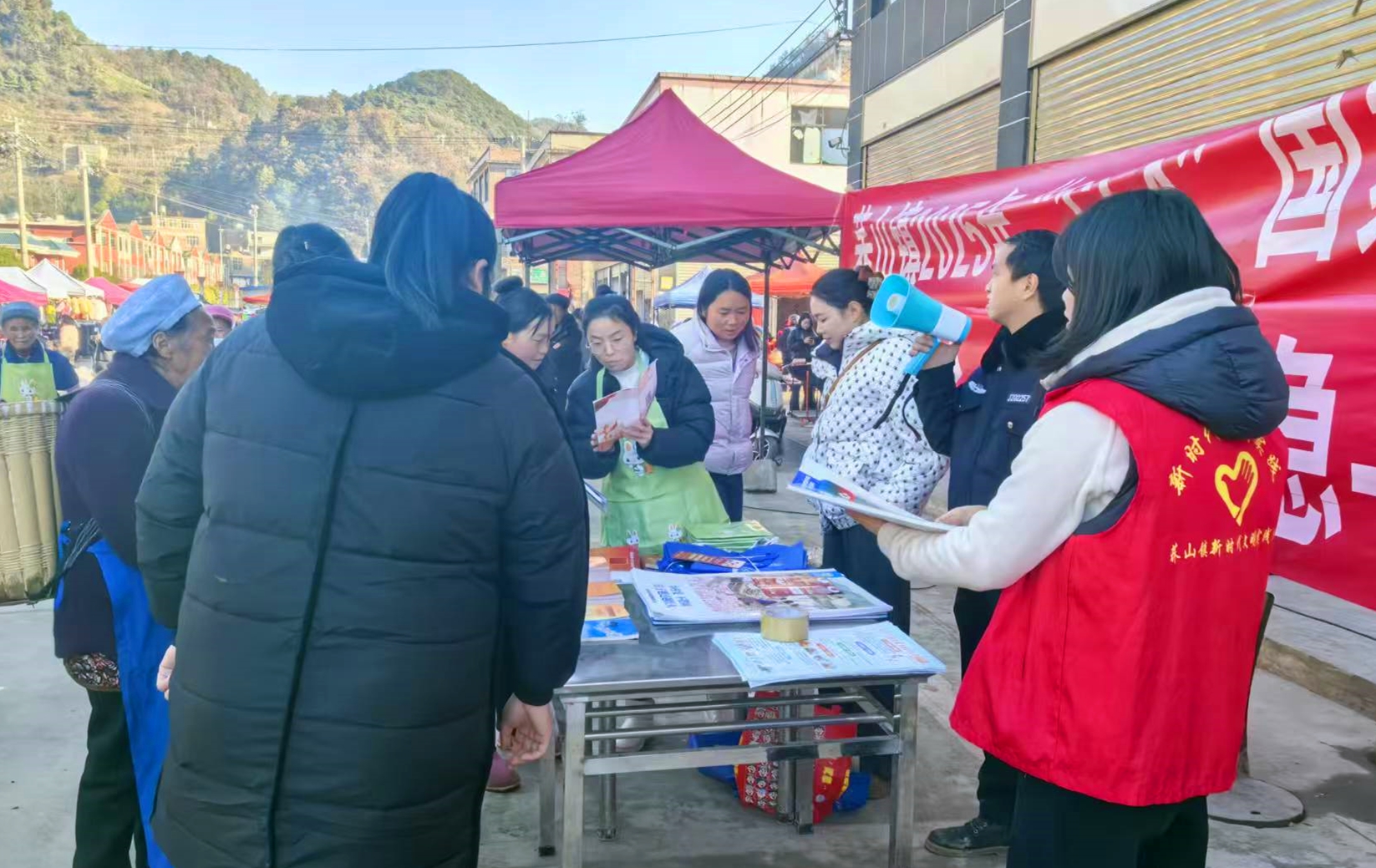 法治赶场接地气,普法服务暖民心。12月5日,荞山镇传统赶集日人头攒动,镇司法所、消防队、新时代文明实践所等部门联合在此设立普法宣传点,将法律知识与便民服务送到群众“家门口”。活动现场,工作人员通过悬挂宣传标语、发放普法资料、现场答疑解惑、结合典型案例释法等多种形式,向过往群众普及宪法、民法典等法律知识及冬季安全常识。针对冬季取暖安全问题,工作人员重点讲解了安全用火规范、一氧化碳中毒预防与应急处置等知识,提醒群众增强安全防范意识,安心过冬。