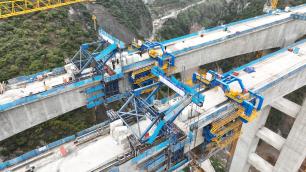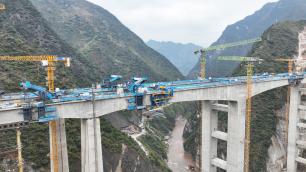 12月9日,在云南省昭通市彝良县境内的渝昆高铁洛泽河特大桥施工现场,施工人员正加速推进桥梁建设。渝昆高铁洛泽河特大桥位于云南省昭通市彝良县境内,是渝昆高铁云南段关键控制性工程。该桥全长524.9米,主跨跨越洛泽河峡谷,采用左右线分修设计,最高墩达150米,是我国在建时速350公里高铁中跨度最大、墩身最高的预应力混凝土桥梁,当前建设者们正在加速推进桥梁合龙施工作业。