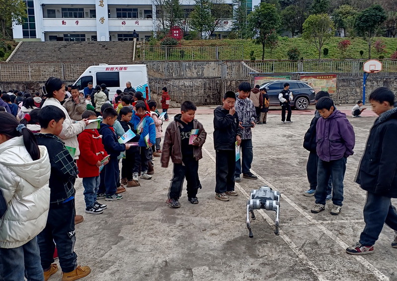科普大篷车分别走进奎香乡吉塘小学、小草坝头道小学。活动现场,市县科协带来的特色科普内容吸引了群众和师生的广泛关注,3辆科普大篷车共搭载60余台(套)涵盖物理、化学、动力学等学科的互动科普展教具。在科普志愿者的引导下,老师与学生齐上阵,相互交流讨论、共同参与实验,在动手实践中感受科学的魅力。同学们还与机器狗积极互动,争相与可爱的“小狗”合影,机器狗也表演后空翻、倒立、直立等高难度动作回应,吸睛一片,成为本次活动当之无愧的团宠,进一步激发了大家对科学探索的兴趣。