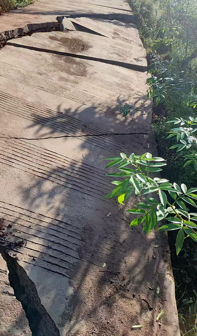 路难行,群众盼修心切。拖脚村覃坪组至中坝组路段是村民出行的主干道。2025年9月,因雨季积水导致水泥路面断裂,偏坡垮塌,堵塞部分路面,交通中断,给村民出行带来了不便。