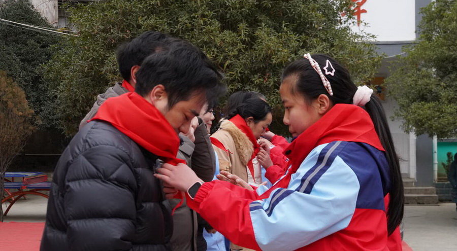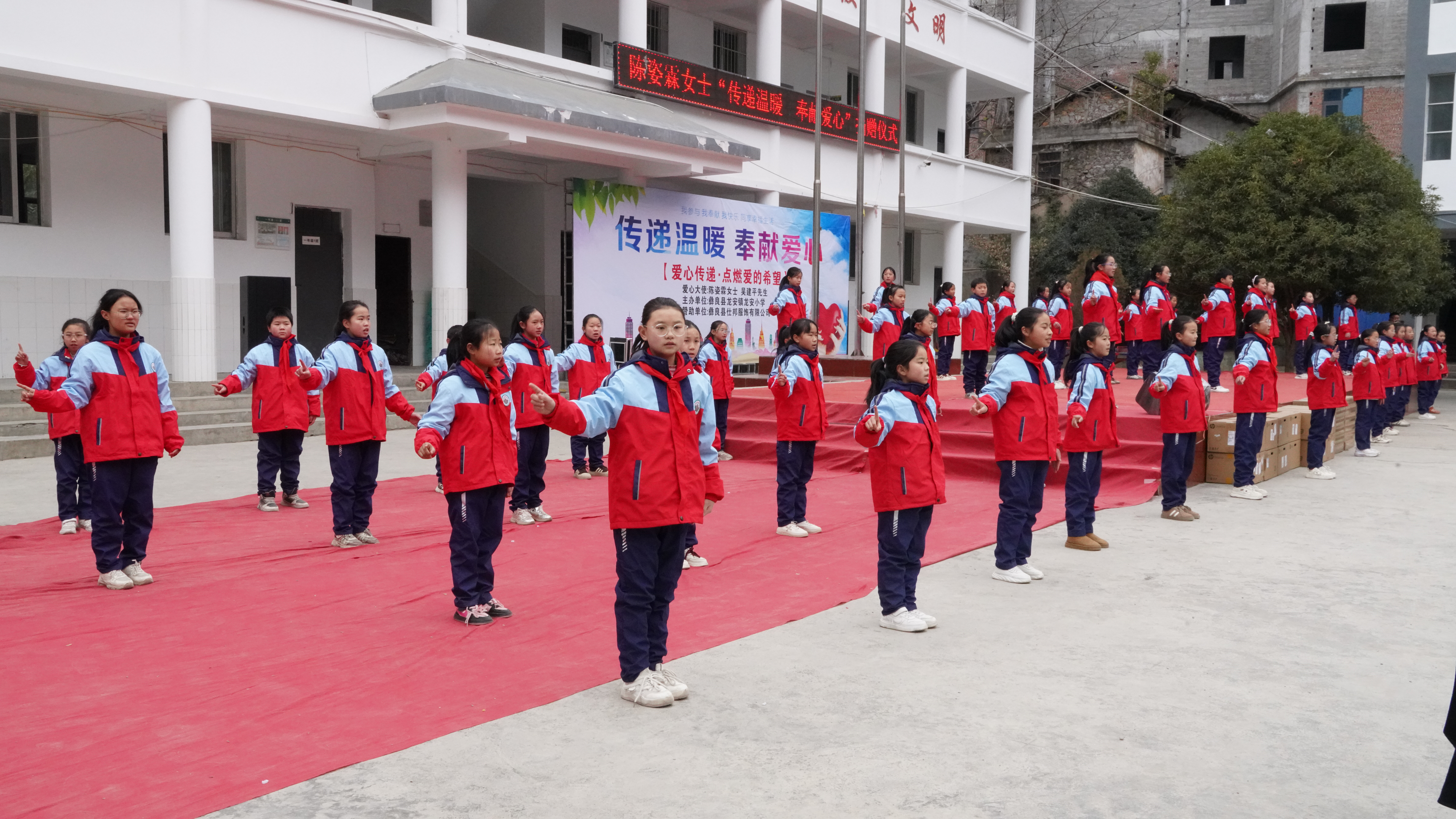 捐赠仪式在庄严的升旗仪式中拉开序幕。鲜艳的国旗下,少先队员代表为陈姿霖女士及爱心团队系上红领巾,用少年队员特有的礼仪表达敬意与感谢。学校负责人代表全校师生郑重接受捐赠,并与爱心人士一同为孩子们穿上崭新的冲锋衣校服,温暖的色彩在冬日校园里格外动人。彝良县教育部门代表现场为陈姿霖女士颁发纪念牌匾及荣誉证书,感谢她情系彝良教育、持续奉献的善举。