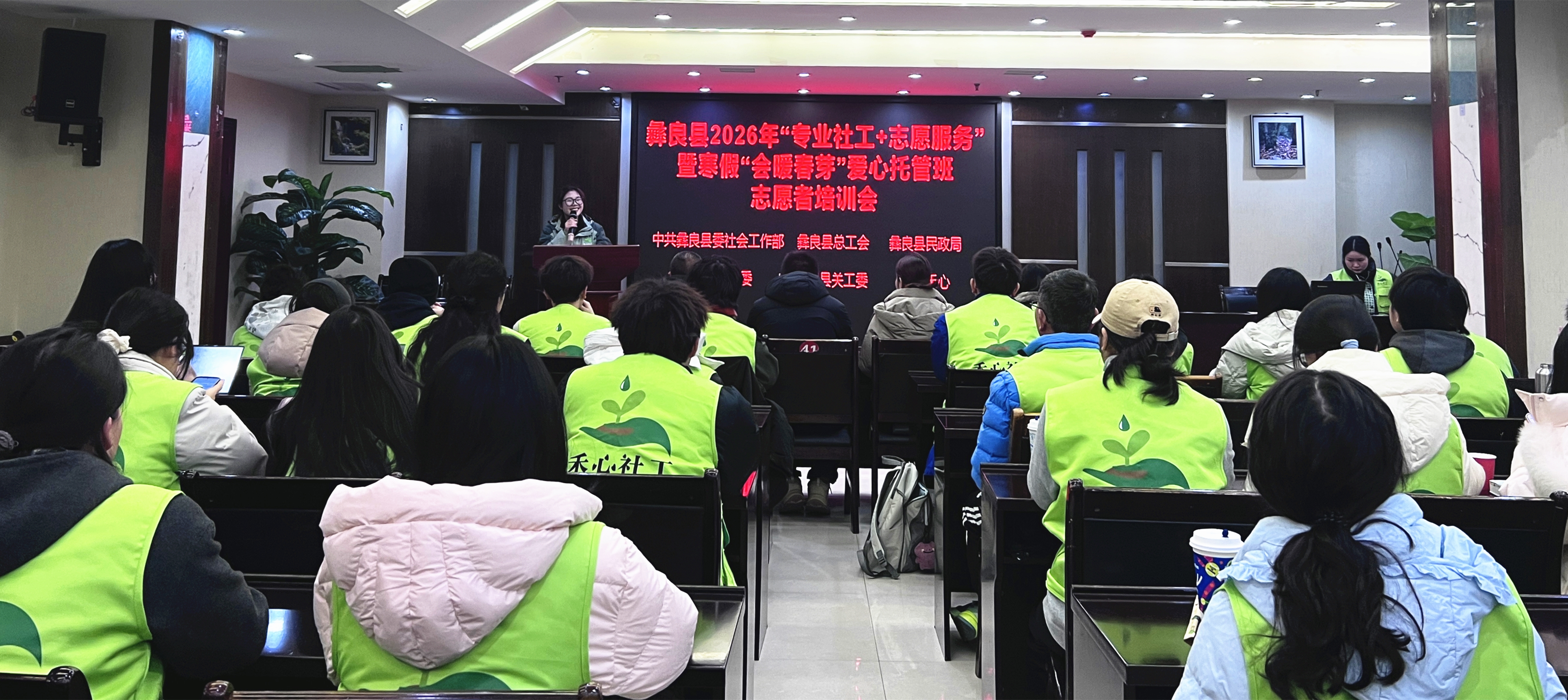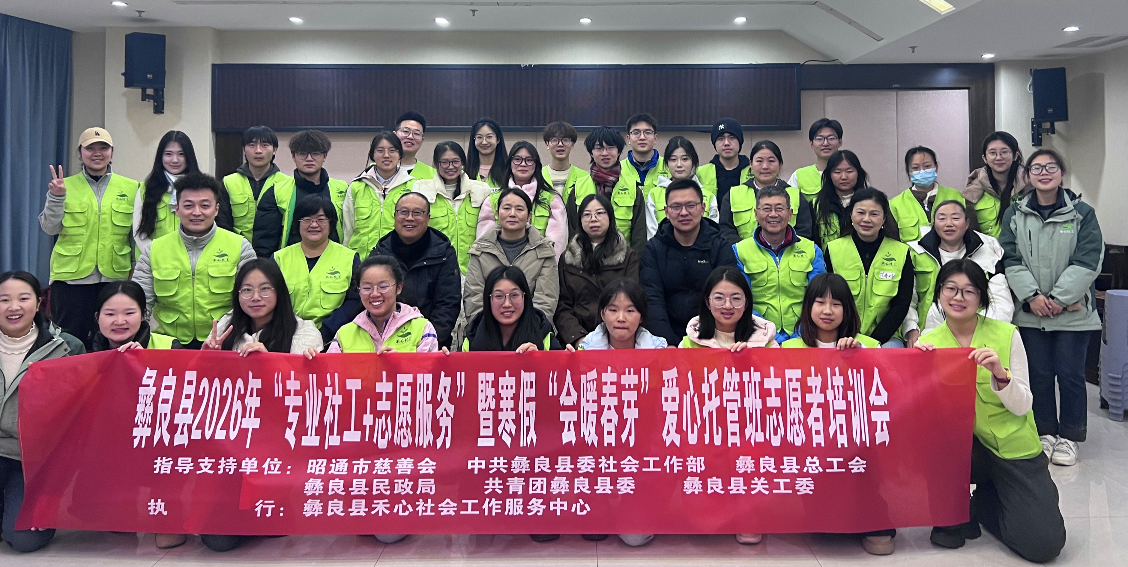 1月21日,中共彝良县委社会工作部联合县关工委、民政局、总工会、团县委及彝良禾心社工,共同开展2026年党建引领“专业社工+志愿服务”暨寒假“会暖春芽”爱心托管班志愿者培训。30余名来自全国各地的志愿者齐聚一堂,系统充电赋能,为即将开展的寒假托管服务筑牢专业根基。