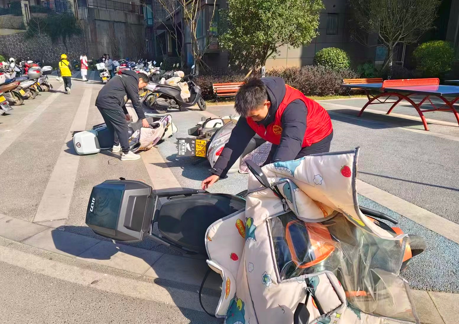 当日下午15时许,辖区阵风风力持续攀升,学府华庭小区主干道及居民停车位内,摩托车、电动车陆续出现倾倒现象,部分车辆叠压在一起,严重影响居民出行。正在该小区开展消防安全检查的社区志愿者发现这一情况后,第一时间停止手头工作,迅速分工、协同作战,奔赴各车辆倾倒点位开展扶车作业。