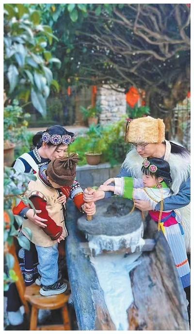 考虑到村里已有民宿酒店和餐馆等业态,村民和杰林另辟蹊径,在家里建起了东巴文化体验馆,游客可以在这里沉浸式体验制作东巴纸、磨豆花等纳西族群众日常生产活动,感受东巴文化。