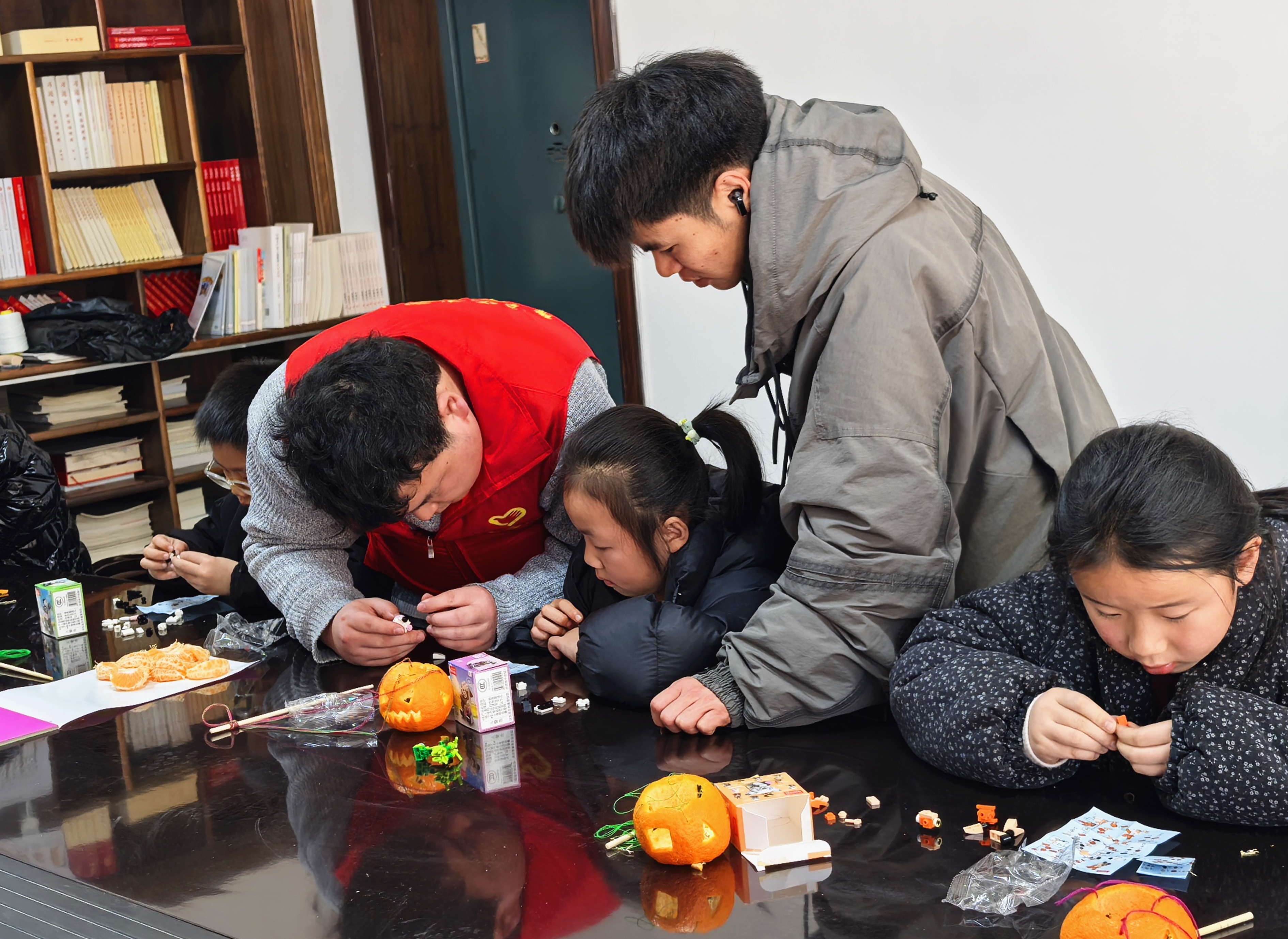 活动现场暖意融融、童趣盎然,社区工作人员提前筹备,精心采购并摆放好新鲜柑橘、彩色卡纸、环保LED灯、积木等各类手工材料,确保孩子们能尽情发挥创意。活动期间,志愿者全程坚守岗位、耐心指导,手把手带领孩子们剥柑橘、固定LED灯源、裁剪粘贴彩纸,一步步将普通的柑橘,打造成造型可爱、暖意十足的橘灯笼;同时,志愿者还陪伴孩子们拼搭积木,鼓励大家大胆想象、互帮互助,在协作中体验乐趣,现场欢声笑语不断,暖意满满。