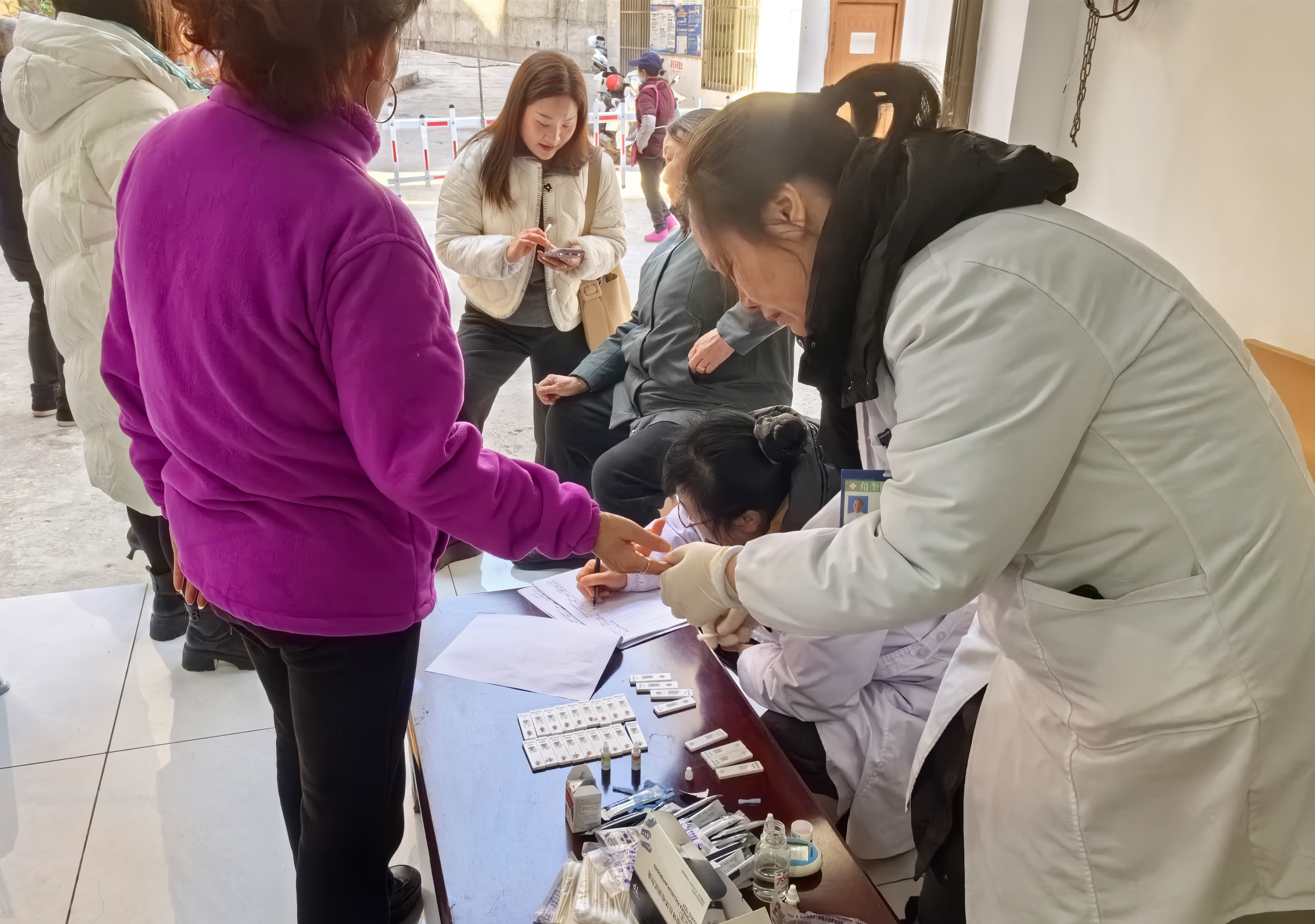 活动现场,社区工作人员提前布置服务点位、梳理服务流程,有序引导居民完成信息登记,耐心解答居民提出的各类健康疑问,缓解群众检测顾虑。塘房卫生所医护人员严格遵循医疗操作规范,全程坚持匿名、保密原则,为有检测需求的居民提供快速HIV检测服务,同步完成采血、结果告知、一对一健康咨询等环节,让群众“足不出社区”就能享受专业的健康筛查服务。