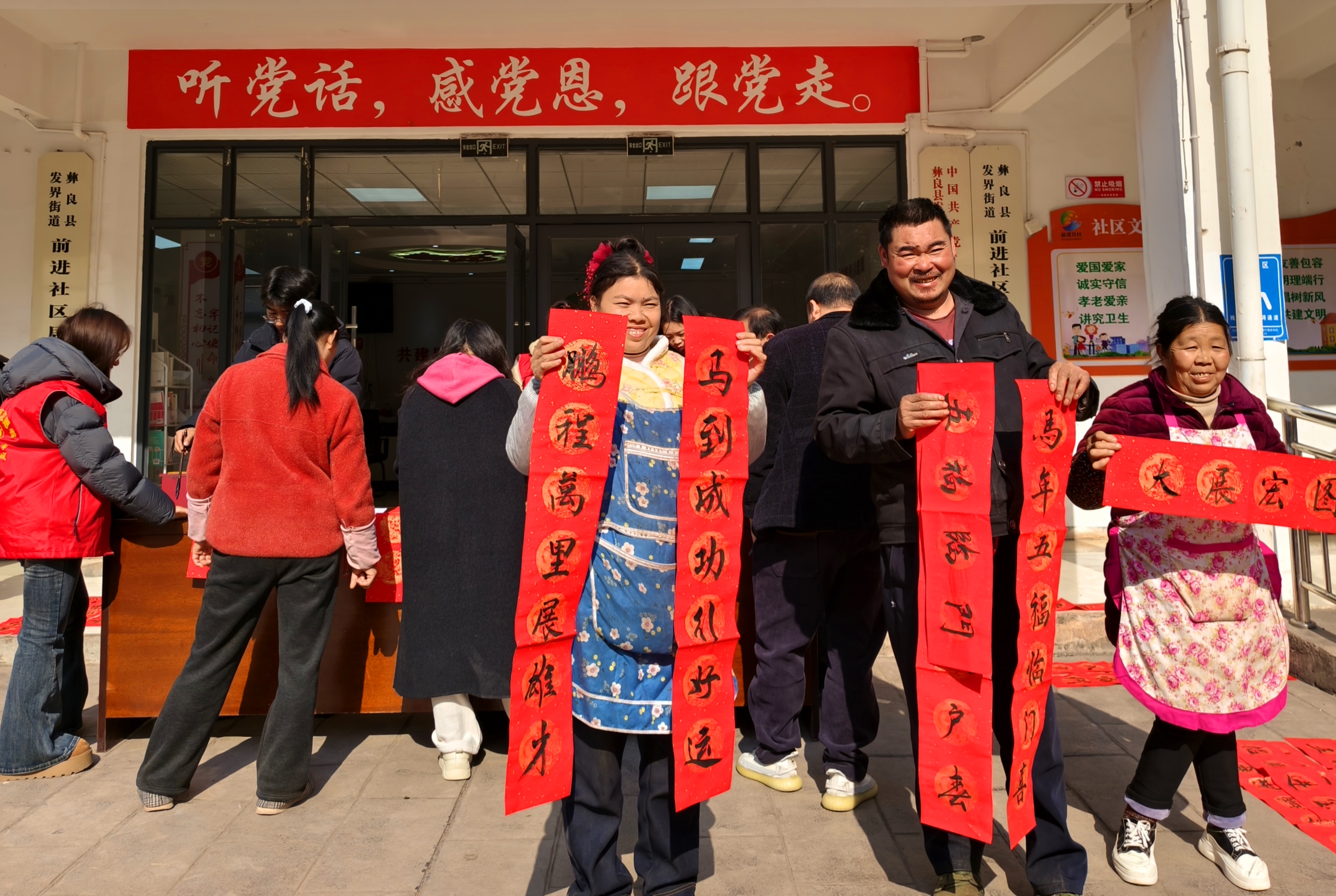 2月13日,彝良县发界街道前进社区以党建为引领,依托新时代文明实践站,在社区小广场开展“写春联 送祝福”活动,为辖区群众免费赠送春联,将新春的美好祝福送到群众家门口。