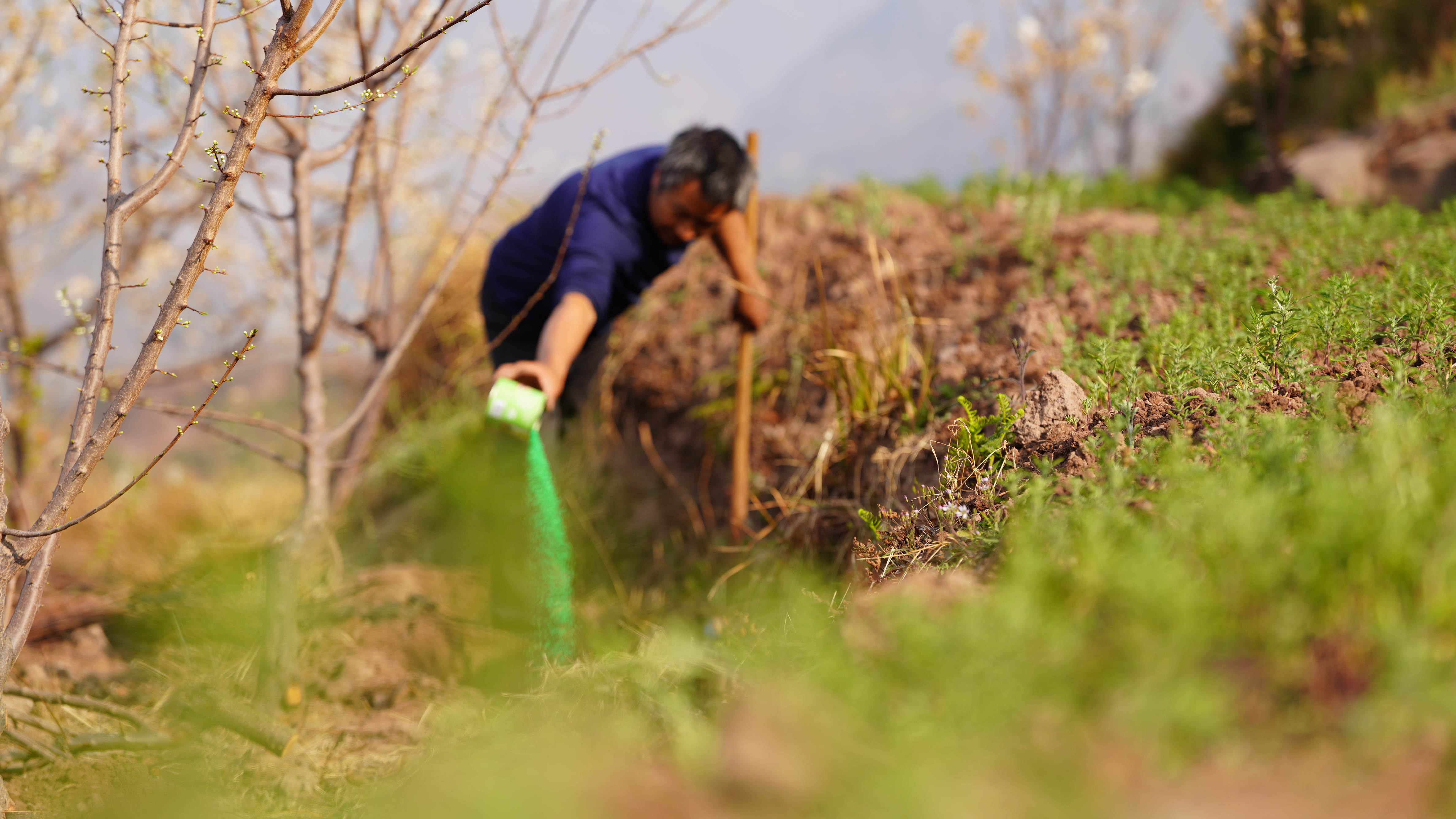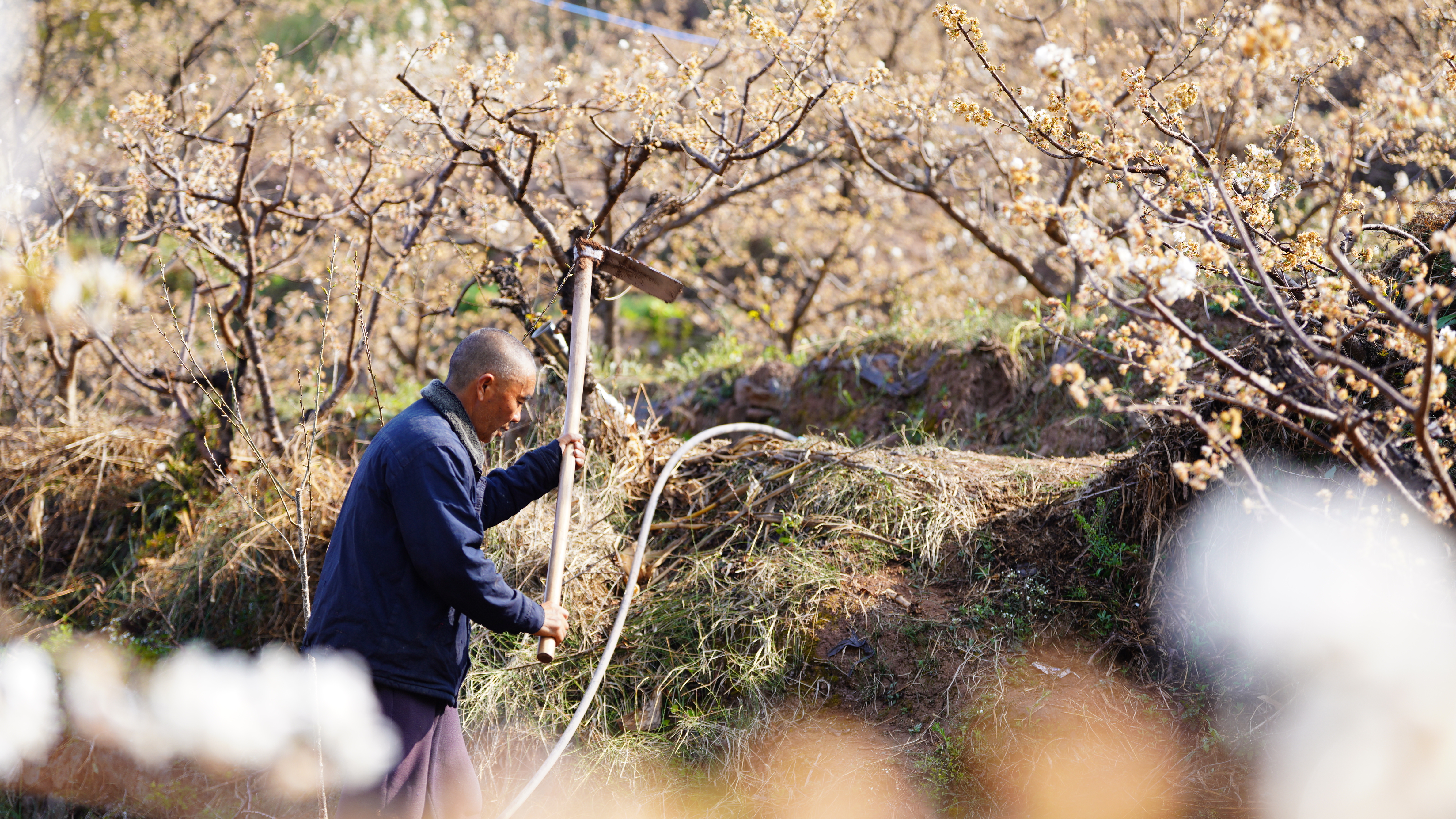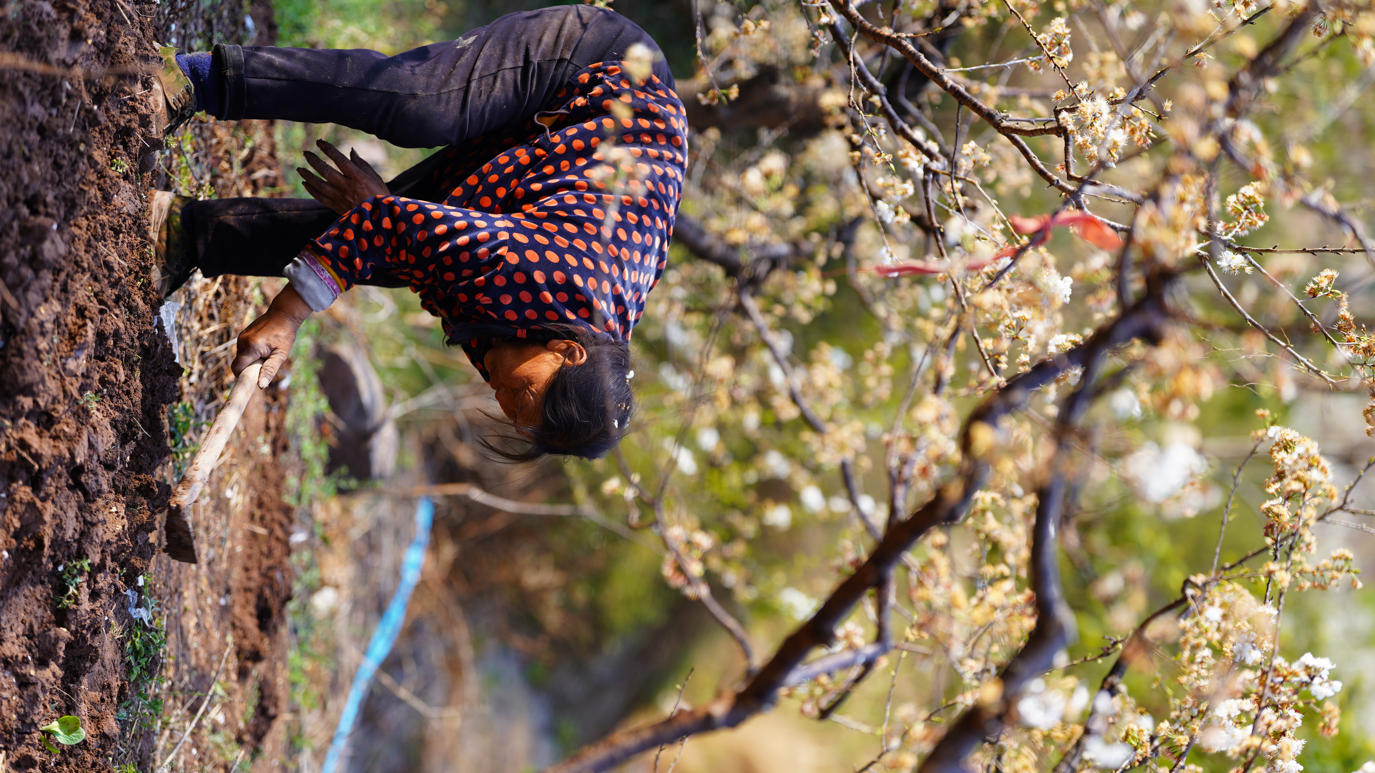 2月24日,角奎街道柒树村中寨组村民正在田间管护果苗。