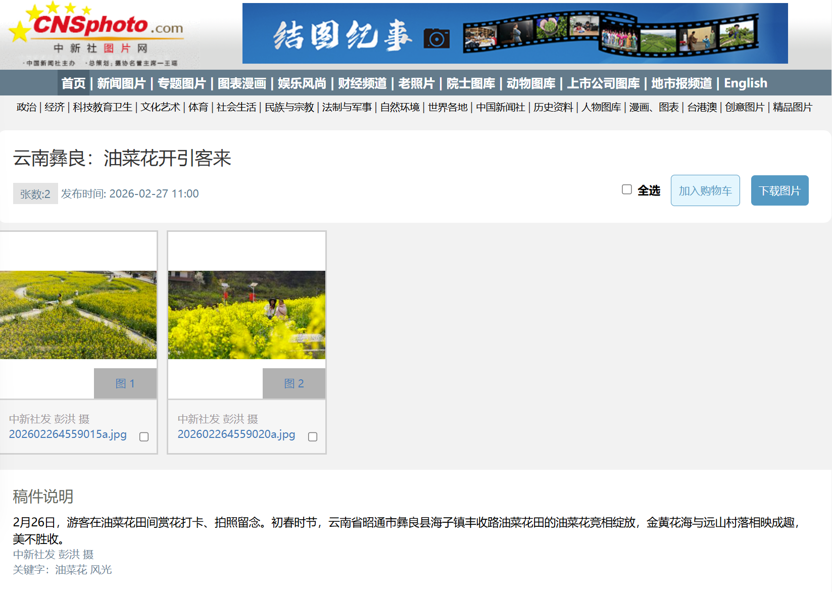 2月26日,游客在油菜花田间赏花打卡、拍照留念。初春时节,云南省昭通市彝良县海子镇丰收路油菜花田的油菜花竞相绽放,金黄花海与远山村落相映成趣,美不胜收。