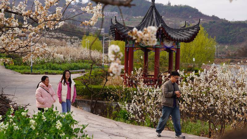 初春时节,昭通市彝良县境内近万亩樱桃花迎春盛放,漫山遍野的花朵如云似雪,将村庄装点成诗意田园,吸引游客踏青赏花。图为游客在云南省昭通市彝良县角奎街道漆树村欣赏樱桃花。