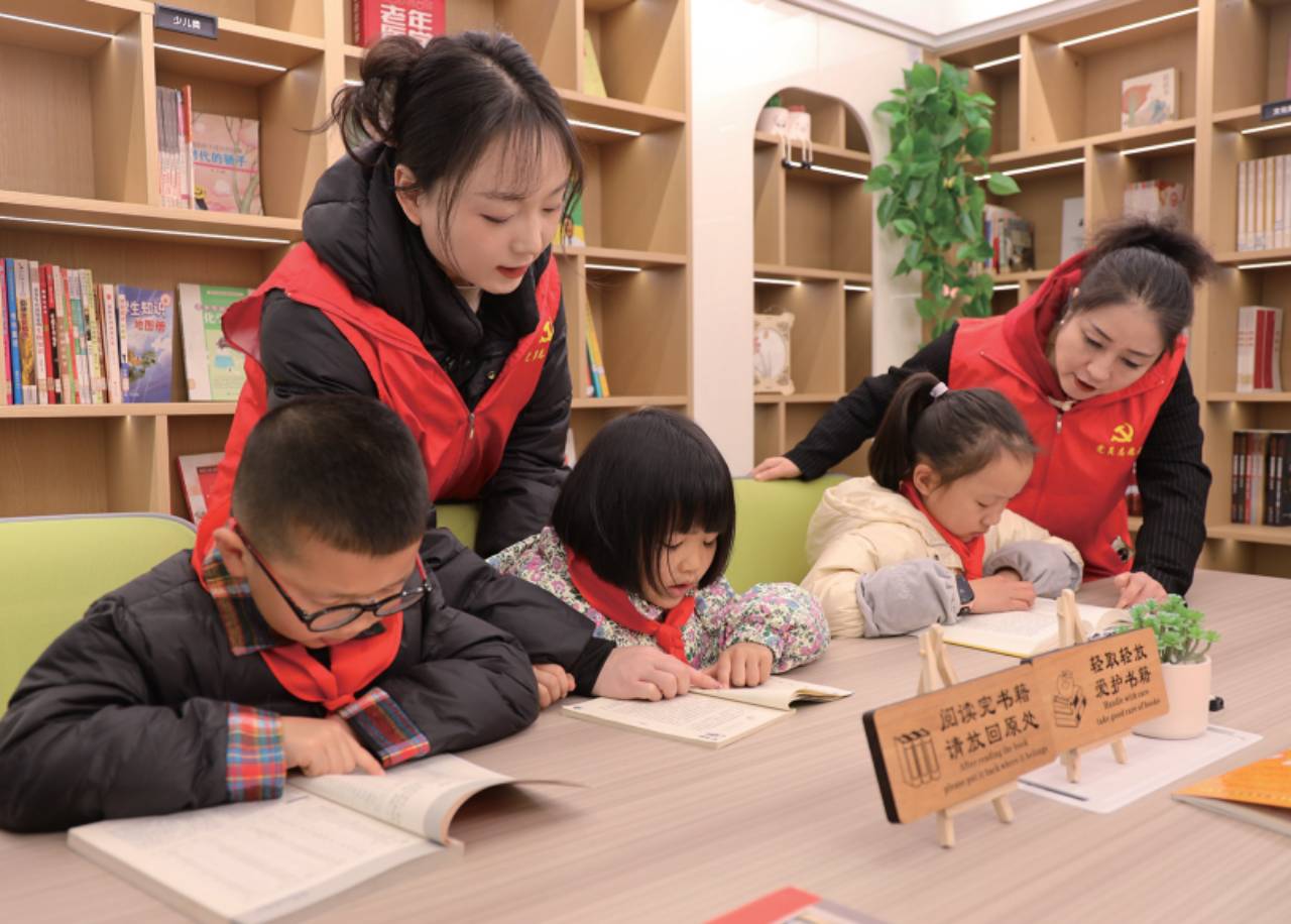 图为大河边社区党员志愿者陪伴孩子们阅读书籍。
