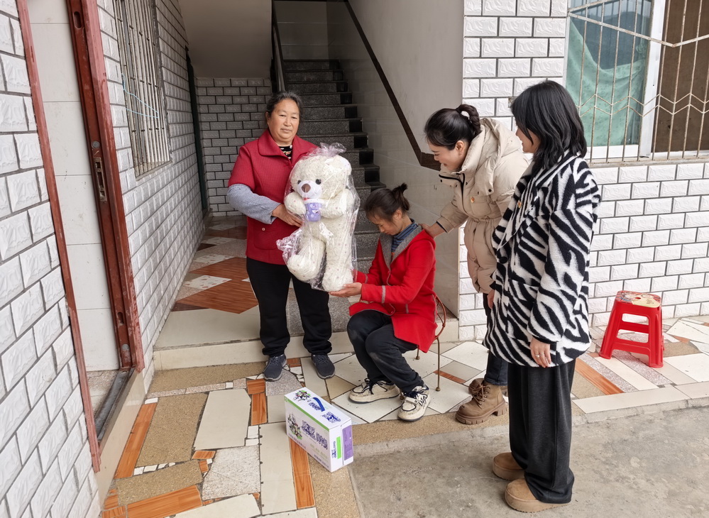 在前期走访摸排的基础上,慰问组来到困境儿童庞某某家中,该儿童是重度残疾人(言语一级和肢体一级),慰问组为孩子送上精心准备的小浣熊、牛奶等礼物。慰问过程中,慰问组与孩子监护人交谈,了解他们家庭情况,鼓励他们树立自强、自立的信念,乐观面对生活中的困难。