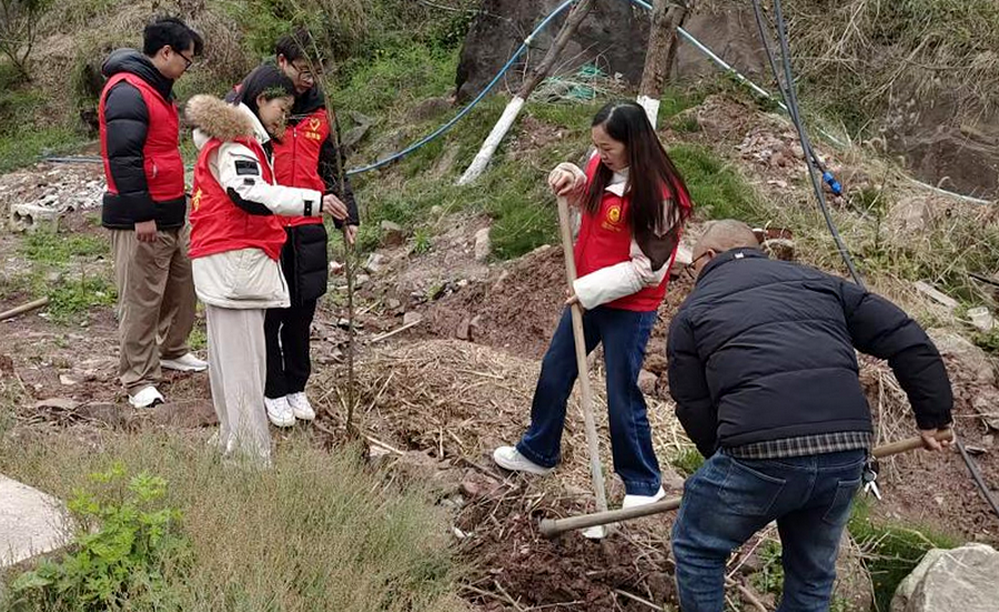活动现场,大家分工明确、干劲十足。有的挥锹挖坑、有的扶苗培土、有的提水浇灌,配合默契。“这路两边种上树,夏天走起来凉快,看着也舒心,咱可得把这些小苗好好栽活!”村民李大姐一边培土一边说道。