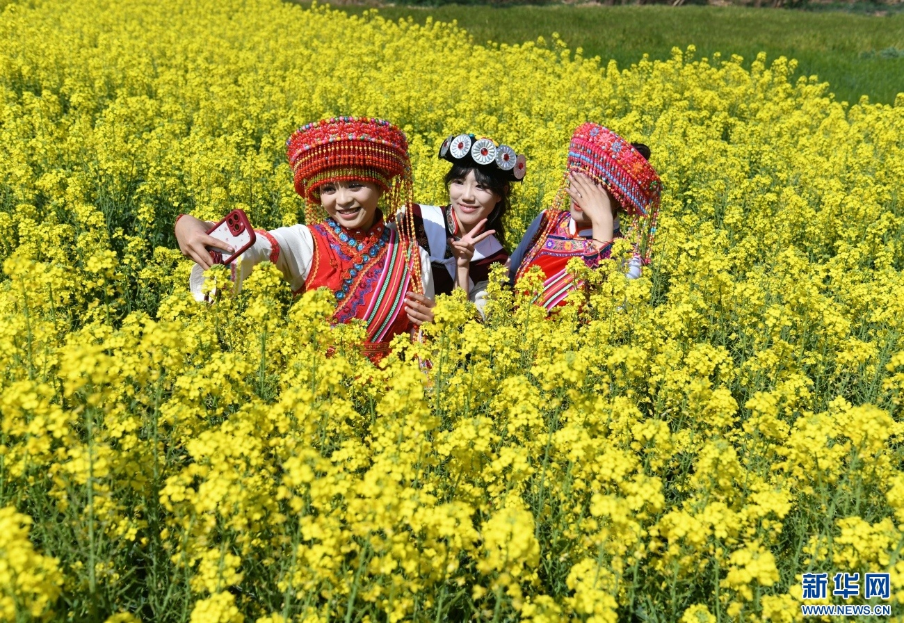 2月26日,在云南省丽江市玉龙县石鼓镇,人们在油菜花田里拍照游玩。新华网发(赵庆祖 摄)