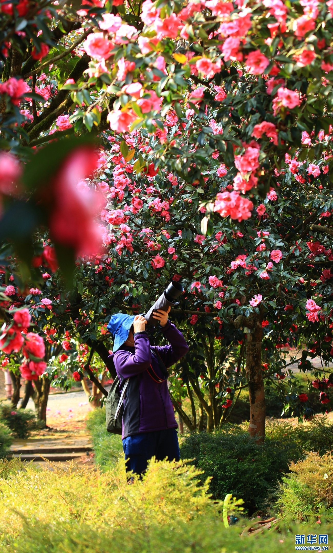 2月27日,云南省腾冲市来凤山国家森林公园,摄影爱好者在茶花园里拍摄。新华网发(赵辉 摄)