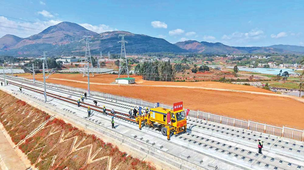 3月18日,渝昆高铁昆明往重庆方向的铺轨施工在位于嵩明县的昆明崔家庄铺轨基地正式启动。
