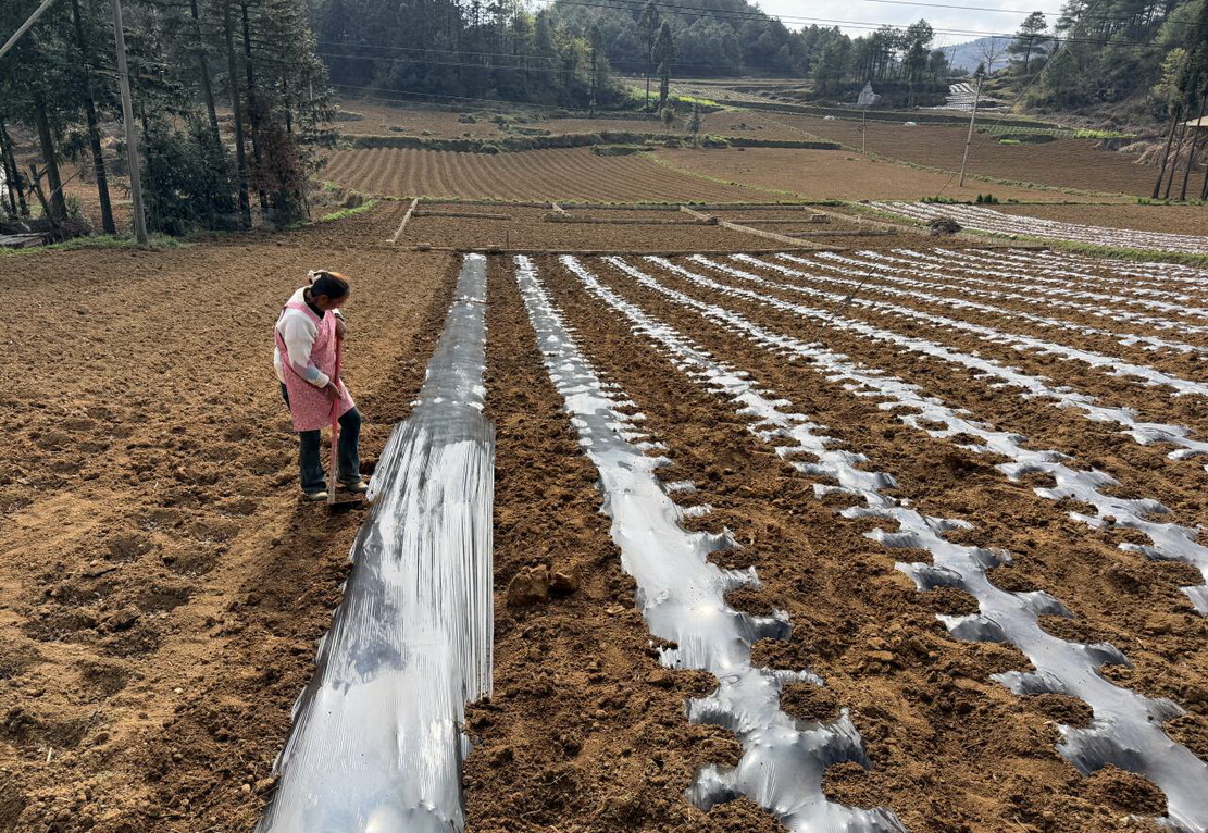 在龙街乡龙洞村、坪子村的玉米种植片区,田垄整齐规范、依山铺展,黑色地膜全覆盖实现保墒增温、抑制杂草,为玉米出苗提供良好条件。田间地头,农户分工明确、协同作业,开墒、打窝、点种、覆土、浇水等工序规范有序。同玉609、昭黄26号等本地优势玉米品种被精准播撒至田间,为粮食增产提供品种保障。