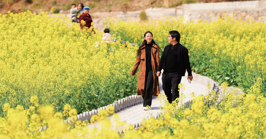 初春时节,彝良县海子镇丰收路油菜花田的油菜花竞相绽放,金色花海与远山村落相映成趣,美不胜收,盎然春意吸引游客穿梭花间小道赏花拍照,尽享春日好时光。图为游客在油菜花田间赏花。