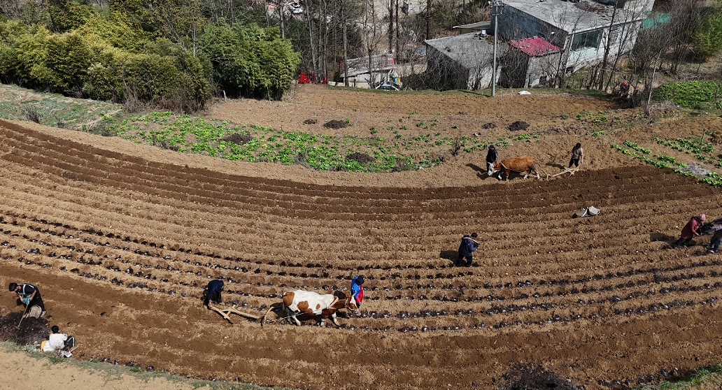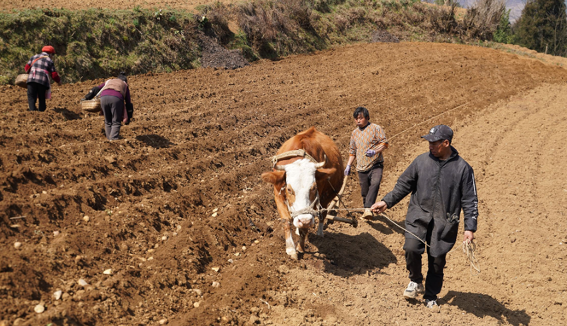 走进树林彝族苗族乡林口村,春日的山野褪去冬日沉寂,焕发出勃勃生机。田垄间,农户们分工协作,打窝、放种、施肥、覆土,一道道工序有条不紊。田间一隅,黄牛拉犁、农夫扶耙,犁铧翻起层层新土,谈笑声、吆喝声与牛哞声交织回荡,勾勒出一幅独具韵味的春耕画卷。