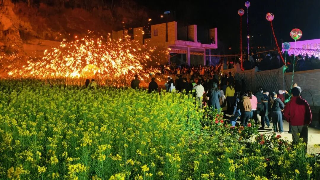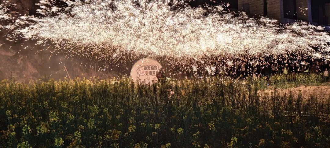 白天,花田喜事相亲会、文艺表演等活动依次开展。民谣、山歌、舞蹈、小品等精彩节目接连登场,赢得现场观众的阵阵掌声,为春日花海增添了浓郁的文化氛围。当夜幕降临,非遗打铁花、篝火晚会惊艳亮相,璀璨的铁花划破夜空,游客围火欢跳、翩翩起舞,在璀璨灯火与烂漫花海中,感受独属于乡村春日的热烈与浪漫。