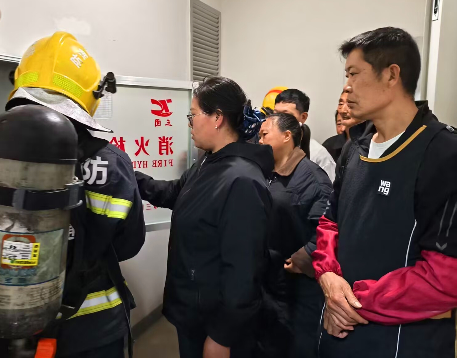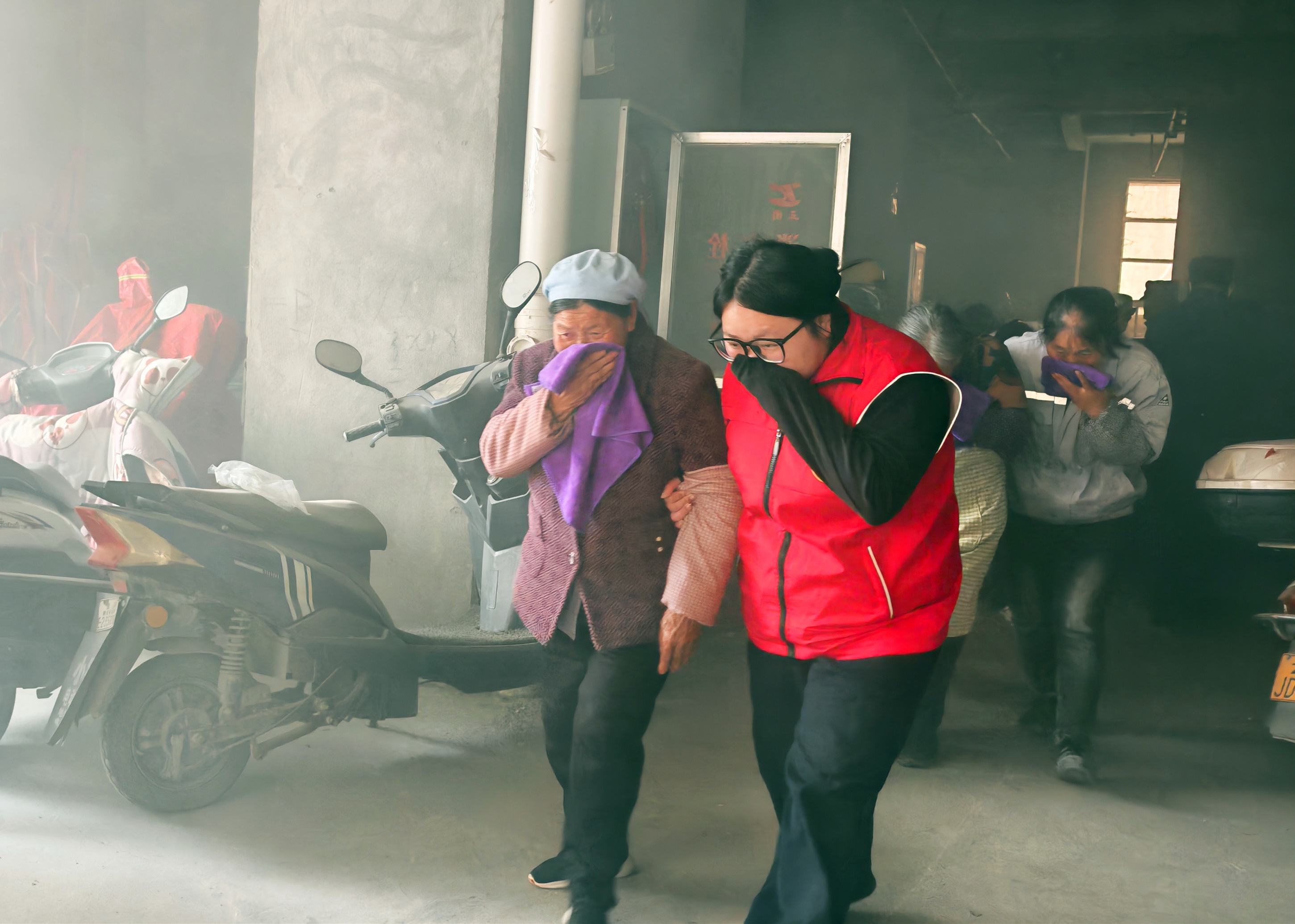 实操演练环节,随着火警警报响起,演练正式启动。在一楼栋居民家中模拟居民楼突发火情场景,社区工作人员、楼层长及志愿者迅速到位,有序指挥引导楼栋居民,用湿毛巾捂住口鼻、弯腰低姿,沿安全通道快速有序撤离至指定安全区域。