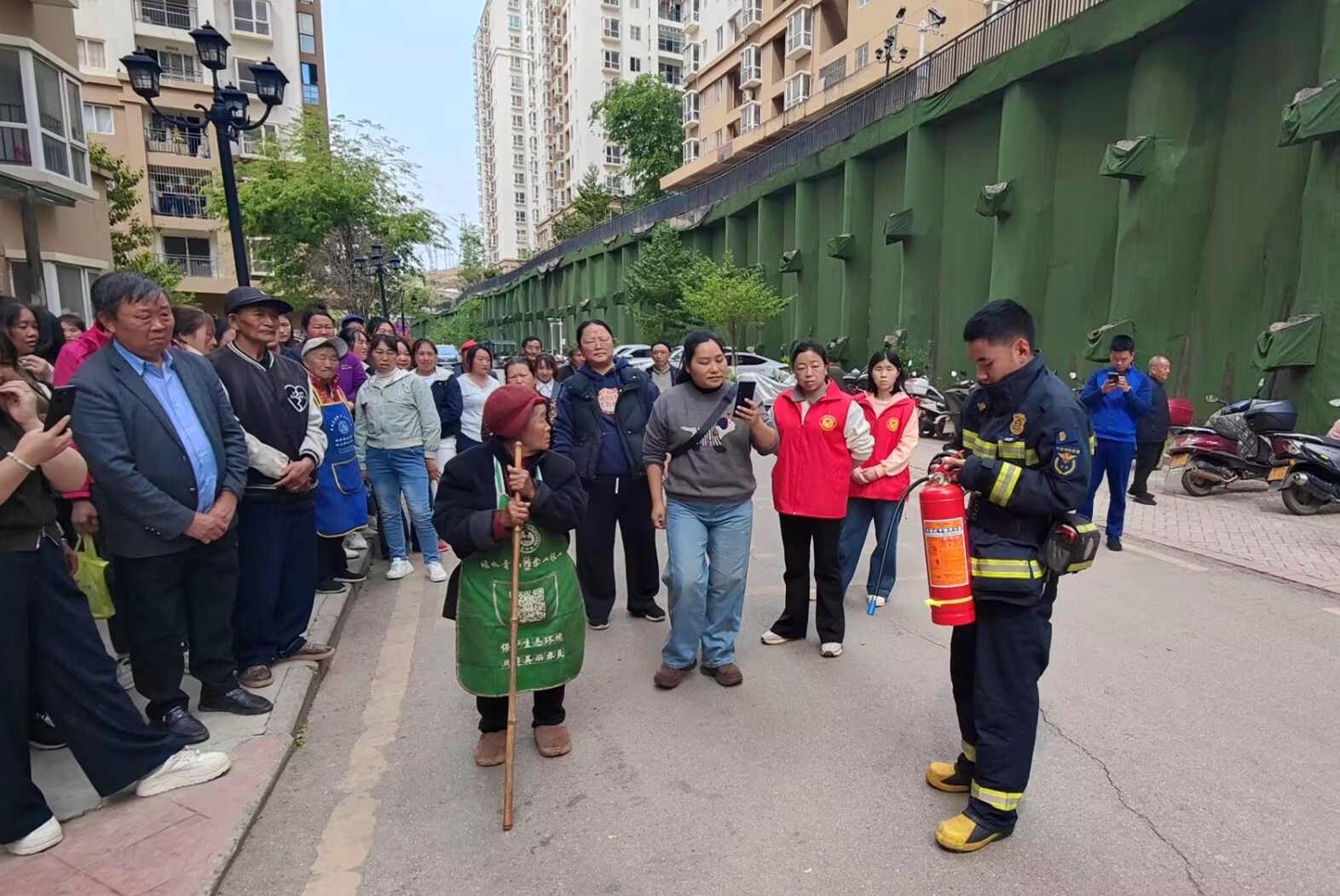 演练开始前,社区工作人员与县消防大队消防员结合社区实际,用通俗易懂的语言,向现场群众讲解应急安全相关知识。重点围绕火灾危害认知、日常防火注意事项、楼道安全疏散、火场逃生技巧、逃生通道识别使用,以及灭火器、消防栓等消防器具的正确使用方法,进行了讲解和培训,并通过真实案例警示群众重视消防安全、杜绝安全隐患。同时,工作人员现场演示了灭火器“一提、二拔、三握、四压”的规范操作流程,鼓励居民、商户亲手实践,切实掌握应急消防器材使用技能;针对家庭用电用气安全、电动车规范停放充电、楼道堆物清理等常见问题,现场进行提醒引导,帮助大家养成良好安全习惯。